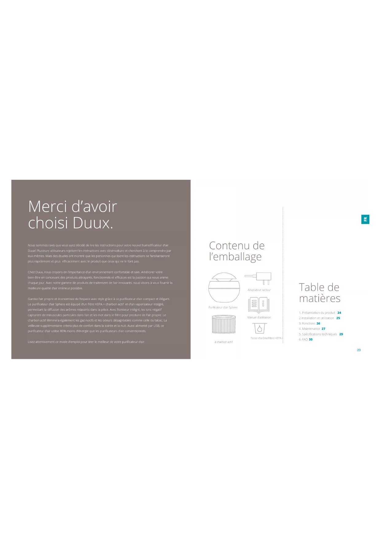 Verwijdering De Europese richtlijn 2012 / 19 / EG inzake Afval van Elektrische en Elek-tronische Apparatuur (AEEA), vereist dat oude elektrische huishoudappa- raten niet in de normale gemeentelijke ongesorteerde afvalstroom mogen worden weggegooid. Oude apparaten moeten apart worden ingezameld om recycling en hergebruik van de materialen daarin te optimaliseren en de gevolgen op het milieu en de volksgezondheid te verminderen. Het symbool met de doorgekruiste “vuilnisbak op wieltjes” op het product, herinnert u aan uw verplichting, dat het toestel bij verwijdering gescheiden ingezameld moet worden. Consumenten moeten contact opnemen met hun lokale autoriteit of verkoper voor informatie betreende de juiste verwijdering van hun oude toestel.2322 Merci d’avoir choisi Duux. Nous sommes ravis que vous ayez décidé de lire les instructions pour votre nouvel humidicateur d’air Duux! Plusieurs utilisateurs rejettent les instructions avec désinvolture et cherchent à le comprendre par eux-mêmes. Mais des études ont montré que les personnes qui lisent les instructions se familiariseront plus rapidement et plus ecacement avec le produit que ceux qui ne le font pas. Chez Duux, nous croyons en l’importance d’un environnement confortable et sain. Améliorer votre bien-être en concevant des produits attrayants, fonctionnels et ecaces est la passion qui nous anime chaque jour. Avec notre gamme de produits de traitement de l’air innovants, nous visons à vous fournir la meilleure qualité d’air intérieur possible. Gardez l’air propre et économisez de l’espace avec style grâce à ce puricateur d’air compact et élégant. Le puricateur d’air Sphere est équipé d’un ltre HEPA + charbon actif et d’un vaporisateur intégré, permettant la diusion des arômes relaxants dans la pièce. Avec l’ioniseur intégré, les ions négatif capturent de minuscules particules dans l’air et les met dans le ltre pour produire de l’air propre. Le charbon actif éliminera également les gaz nocifs et les odeurs désagréables comme celle du tabac. La veilleuse supplémentaire créera plus de confort dans la soirée et la nuit. Aussi alimenté par USB, ce puricateur d’air utilise 80% moins d’énergie que les puricateurs d’air conventionnels. Lisez attentivement ce mode d’emploi pour tirer le meilleur de votre puricateur d’air.