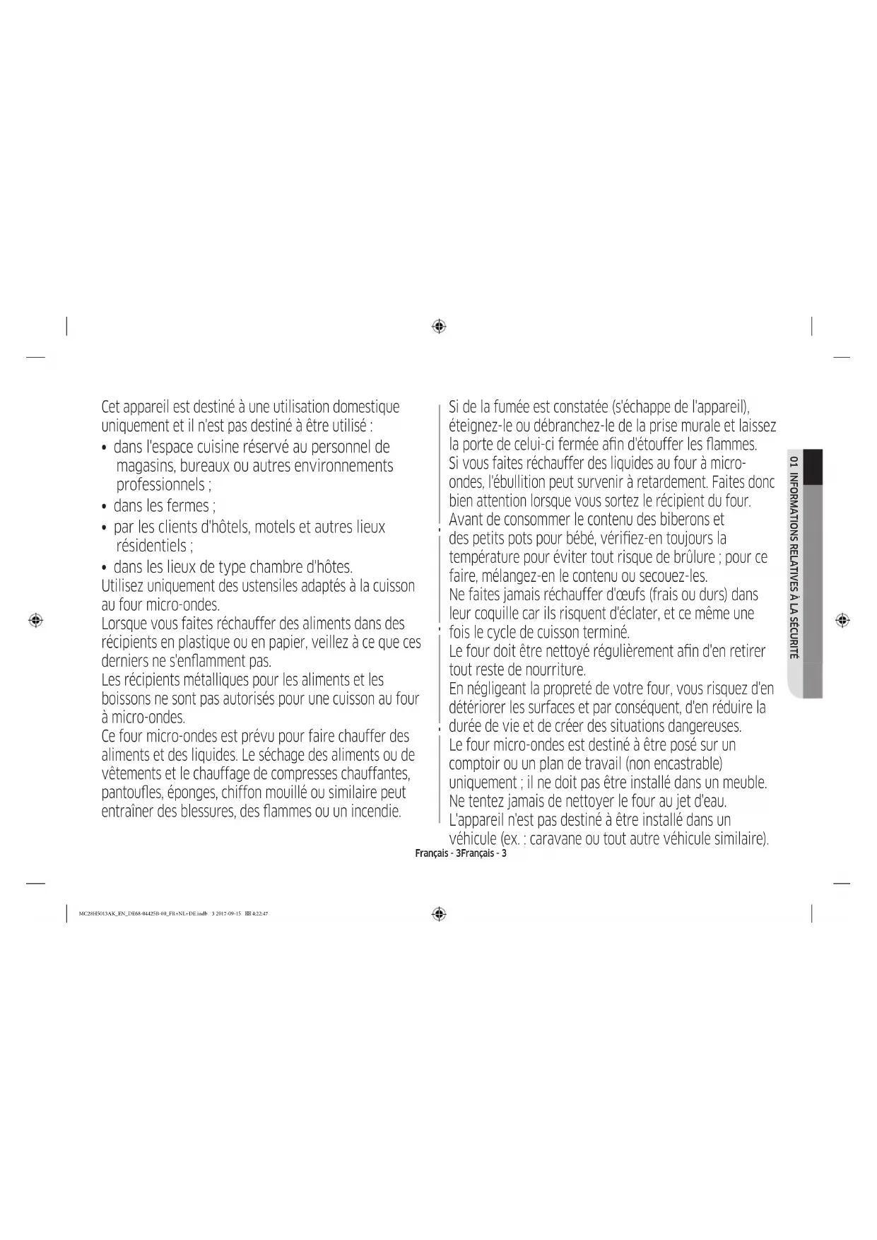un monde de possibilités Nous vous remercions d'avoir choisi ce produit Samsung. Four à micro-ondes Instructions et guide de cuisson MC28H5013** Veuillez noter que la garantie Samsung n'inclut pas les déplacements du service après-vente pour expliquer le fonctionnement de l'appareil, corriger une installation non correcte ou effectuer des opérations de nettoyage ou d'entretien normaux. MC28H5013AK_EN_DE68-04425B-00_FR+NL+DE.indb 1 2017-09-15 4:22:47Français - 2Français - 2 consignes de sécurité