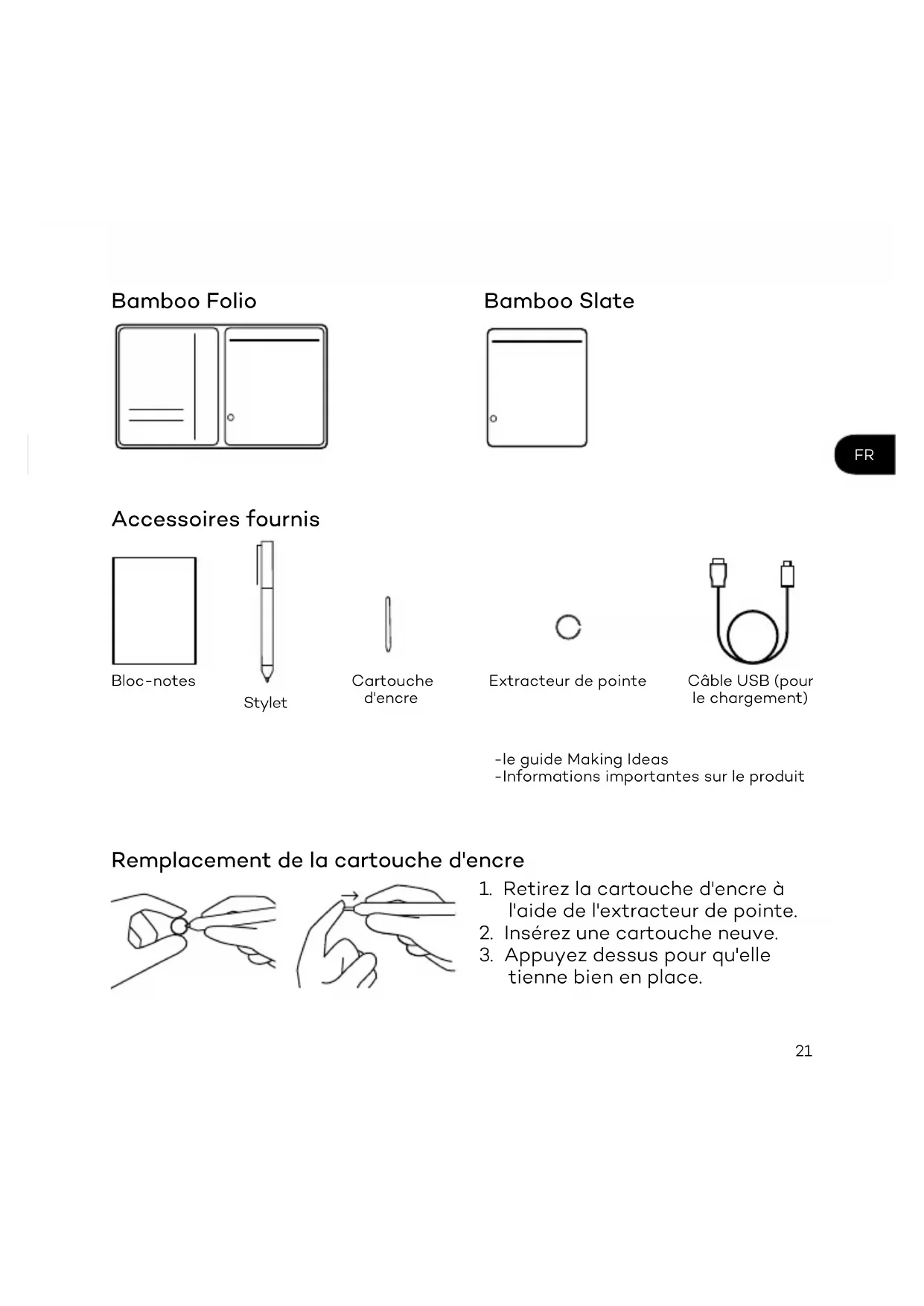 Bamboo Folio Accessoires fournis Remplacement de la cartouche d'encre -le guide Making Ideas -Informations importantes sur le produit