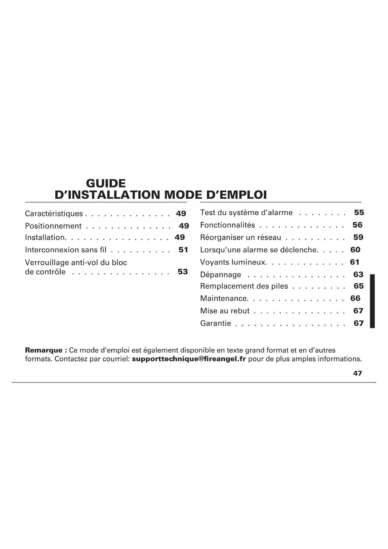 - Contactez le numéro d’urgence de votre fournisseur de combustible (conservez ce numéro bien en vue).61 VOYANTS LUMINEUX Voyant lumineux rouge d’alerte CO Voyant lumineux rouge d’alerte fumée/chaleur Voyant lumineux jaune d’anomalie Statut Action requise Clignote pendant 10secondes, toutes les heures Clignote pendant 10secondes, toutes les heures Clignote pendant 10secondes, toutes les heures Le bloc de contrôle ne fait pas partie du réseau. Veuillez vous reporter à la section «Interconnexion sans l» pour «congurer » le bloc de contrôle au réseau. Clignote rapide- ment une fois par seconde Alerte : Une émanation de monoxyde de carbone a été détectée. Gardez votre calme et ouvrez les portes et les fenêtres an d’aérer les lieux. Clignote rapide- ment une fois par seconde Alerte : De la fumée ou une chaleur excessive a été détectée. Gardez votre calme et évacuez le logement. Clignote une fois toutes les 5secondes La batterie est faible. Retirez les piles existantes et remplacez-les par des piles neuves de l’un des modèles recommandés. Clignote rapidement Cela indique une défaillance interne grave du module radio. Veuillez contacter l’assistance technique au: 0800 940 078 ou par e-mail à l’adresse supporttechnique@reangel.fr.62 Voyant lumineux rouge d’alerte CO Voyant lumineux rouge d’alerte fumée/chaleur Voyant lumineux jaune d’anomalie Statut Action requise Les trois voyants clignotent ensemble ( + + ) 3 fois, suivi d’un quatrième clignotement ( + uniquement). Cette séquence de clignotement est répétée. Cela signie que le mode Réorganisation a échoué. Pour quitter le mode Réorganisation, maintenez enfoncé le bouton «Localisation» pendant 5 secondes. Attendez quelques minutes et maintenez enfoncé le bouton «Localisation» pendant 5 secondes pour réactiver le mode Réorganisation. Le voyant lumineux d’alerte monoxyde de carbone ou le voyant lumineux d’alerte fumée / chaleur clignote toutes les 10secondes Cela indique que l’un des détecteurs a été activé. Veuillezvous reporter à la section «Localisation» de ce manuel. Le voyant lumineux d’alerte monoxyde de carbone ou le voyant lumineux d’alerte fumée / chaleur clignote deux fois toutes les secondes. Clignote deux fois toutes les secondes. Un appareil du réseau présente un dysfonctionnement. Veuillez consulter « Identication d’un appareil défectueux du réseau ».63 DÉPANNAGE Problème Solution Aucun voyant ne s’allume lorsque j’appuie sur un des boutons du bloc de contrôle Rien ne se passe si vous appuyez sur le bouton «Localisation» alors qu’aucun détecteur n’est déclenché ou qu’aucune anomalie n’est détectée. Cela peut également indiquer que l’activation du bloc de contrôle ne s’est pas correctement déroulée, voir la section «Activation du bloc de contrôle d’alarme». Rien ne se passe lorsque j’appuie sur le bouton Test Cela indique que l’activation du bloc de contrôle ne s’est pas correctement déroulée, voir la section «Activation du bloc de contrôle d’alarme». Impossible de retirer le bloc de contrôle de son support Vous devez désengager les goupilles de verrouillage. Reportez-vous à la section «Verrouillage anti-vol du bloc de contrôle ». Pour toute question concernant le fonctionnement du Bloc de contrôle d’alarme, contacter le service d'assistance technique par courriel : supporttechnique@fireangel.fr. Vous pouvez également consulter la section d'assistance de notre site web www.fireangel.fr.64 Tableau de compatibilité WTSL Fonction WST-630 (Modèles antérieurs à 2014) WST-630 (Modèles postérieurs à 2014)