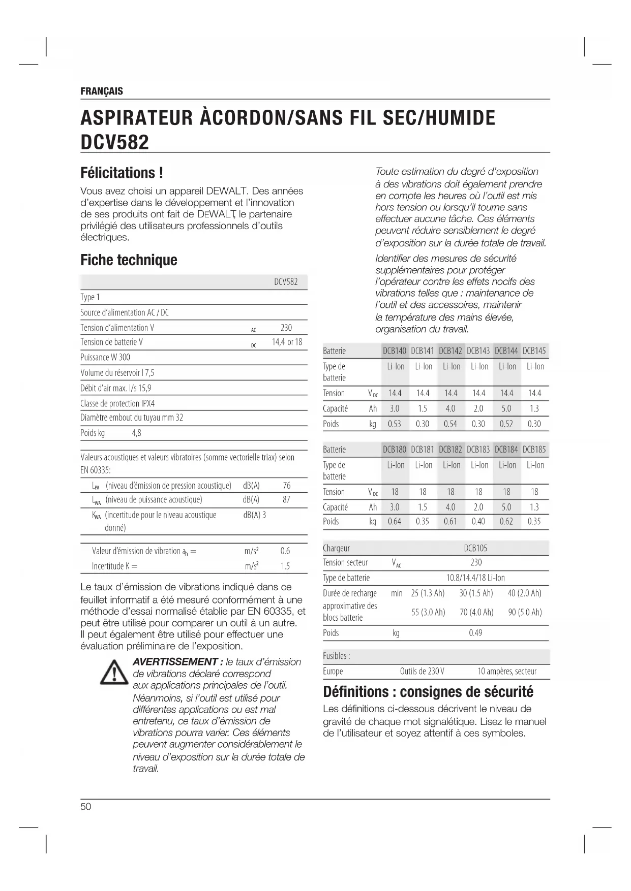 - Las batería de litio-ión son reciclables. Llévelas a su distribuidor o punto de reciclaje local. Los paquetes de batería recogidos serán reciclados o eliminados adecuadamente.50 Français Félicitations! Vous avez choisi un appareil DeWALT. Des années d’expertise dans le développement et l’innovation de ses produits ont fait de DeWALT , le partenaire privilégié des utilisateurs professionnels d’outils électriques. Fiche technique DCV582 Type 1 Source d’alimentation AC / DC Tension d’alimentation V