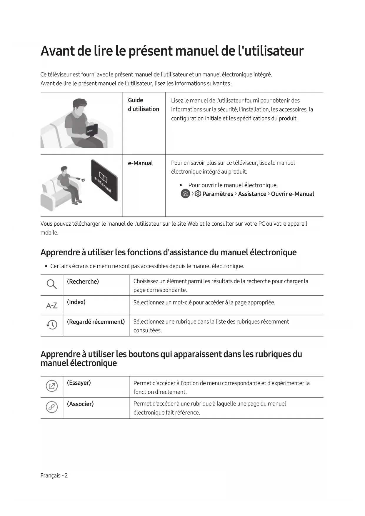 - Pour ouvrir le manuel électronique, > Paramètres > Assistance > Ouvrir e-Manual Vous pouvez télécharger le manuel de l'utilisateur sur le site Web et le consulter sur votre PC ou votre appareil mobile. Apprendre à utiliser les fonctions d'assistance du manuel électronique