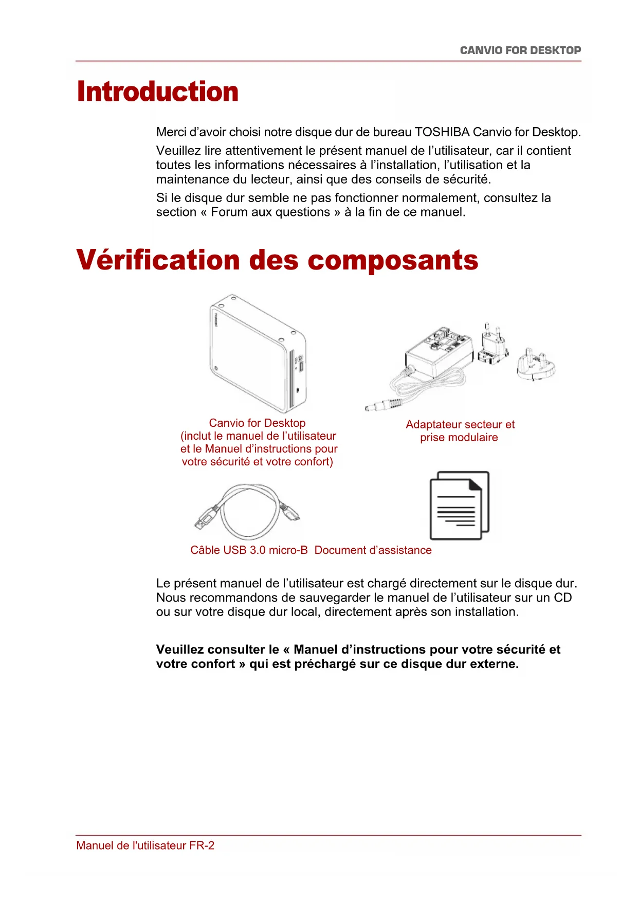 Introduction Merci d’avoir choisi notre disque dur de bureau TOSHIBA Canvio for Desktop. Veuillez lire attentivement le présent manuel de l’utilisateur, car il contient toutes les informations nécessaires à l’installation, l’utilisation et la maintenance du lecteur, ainsi que des conseils de sécurité. Si le disque dur semble ne pas fonctionner normalement, consultez la section « Forum aux questions » à la fin de ce manuel. Vérification des composants Le présent manuel de l’utilisateur est chargé directement sur le disque dur. Nous recommandons de sauvegarder le manuel de l’utilisateur sur un CD ou sur votre disque dur local, directement après son installation. Veuillez consulter le « Manuel d’instructions pour votre sécurité et votre confort » qui est préchargé sur ce disque dur externe. Canvio for Desktop (inclut le manuel de l’utilisateur et le Manuel d’instructions pour votre sécurité et votre confort) Adaptateur secteur et prise modulaire Câble USB 3.0 micro-B Document d’assistanceManuel de l'utilisateur FR-3