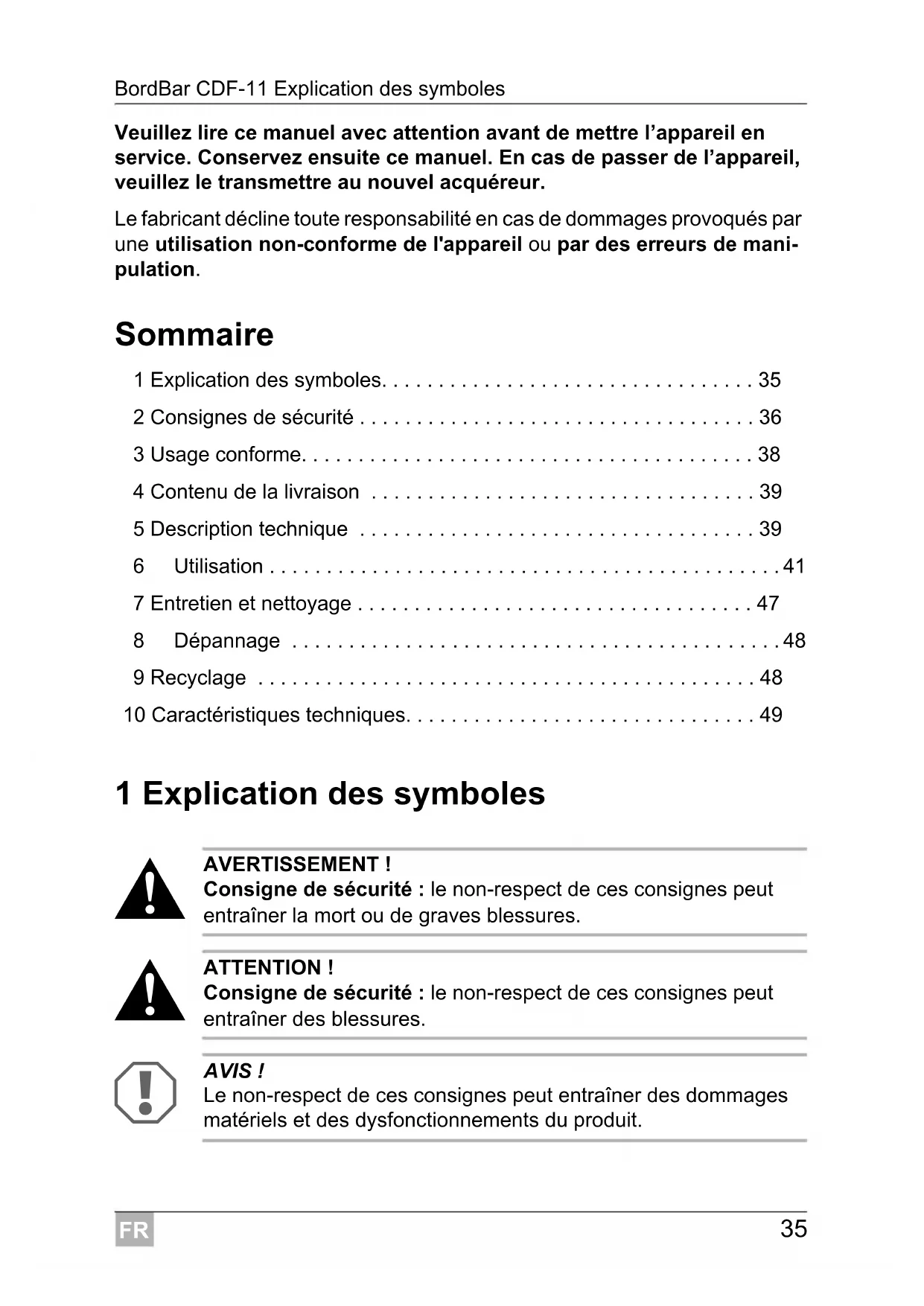 - Veuillez lire ce manuel avec attention avant de mettre l’appareil en service. Conservez ensuite ce manuel. En cas de passer de l’appareil, veuillez le transmettre au nouvel acquéreur. Le fabricant décline toute responsabilité en cas de dommages provoqués par une utilisation non-conforme de l'appareil ou par des erreurs de mani- pulation. Sommaire 1 Explication des symboles p. 35