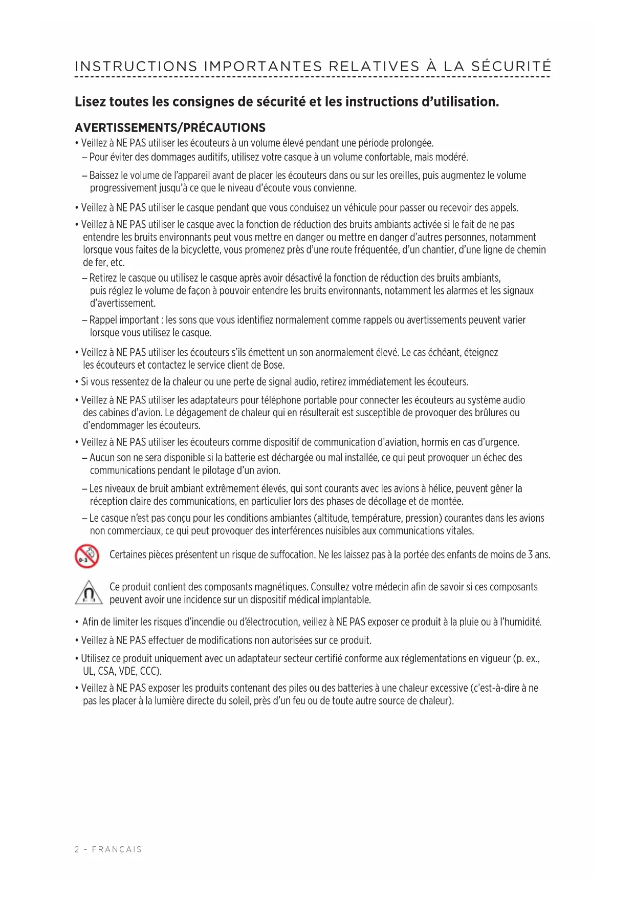 - Veillez à NE PAS utiliser les écouteurs comme dispositif de communication d’aviation, hormis en cas d’urgence. – Aucun son ne sera disponible si la batterie est déchargée ou mal installée, ce qui peut provoquer un échec des communications pendant le pilotage d’un avion. – Les niveaux de bruit ambiant extrêmement élevés, qui sont courants avec les avions à hélice, peuvent gêner la réception claire des communications, en particulier lors des phases de décollage et de montée. – Le casque n’est pas conçu pour les conditions ambiantes (altitude, température, pression) courantes dans les avions non commerciaux, ce qui peut provoquer des interférences nuisibles aux communications vitales. Certaines pièces présentent un risque de suffocation. Ne les laissez pas à la portée des enfants de moins de 3 ans. Ce produit contient des composants magnétiques. Consultez votre médecin afin de savoir si ces composants peuvent avoir une incidence sur un dispositif médical implantable.