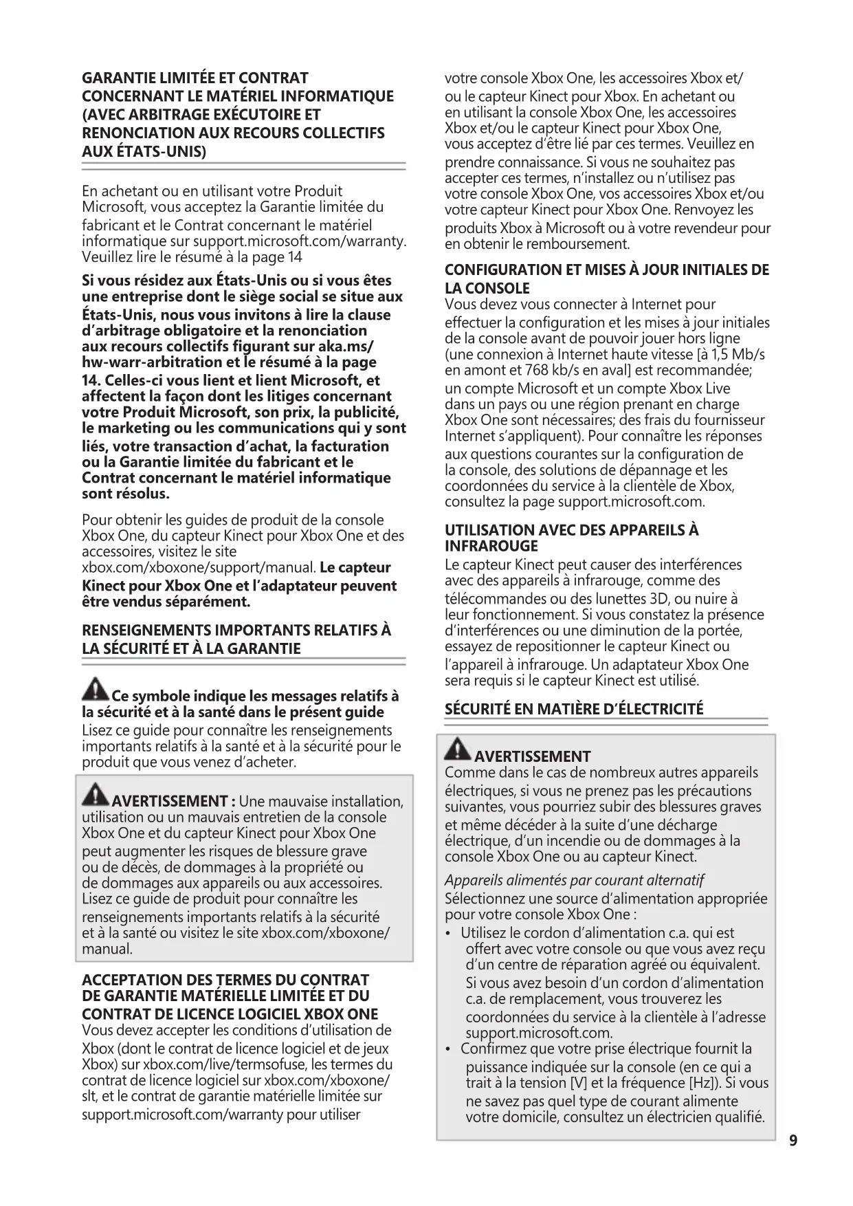 Vous devez accepter les conditions d’utilisation de Xbox (dont le contrat de licence logiciel et de jeux Xbox) sur xbox.com/live/termsofuse, les termes du contrat de licence logiciel sur xbox.com/xboxone/ slt, et le contrat de garantie matérielle limitée sur support.microsoft.com/warranty pour utiliser votre console Xbox One, les accessoires Xbox et/ ou le capteur Kinect pour Xbox. En achetant ou en utilisant la console Xbox One, les accessoires Xbox et/ou le capteur Kinect pour Xbox One, vous acceptez d’être lié par ces termes. Veuillez en prendre connaissance. Si vous ne souhaitez pas accepter ces termes, n’installez ou n’utilisez pas votre console Xbox One, vos accessoires Xbox et/ou votre capteur Kinect pour Xbox One. Renvoyez les produits Xbox à Microsoft ou à votre revendeur pour en obtenir le remboursement.
