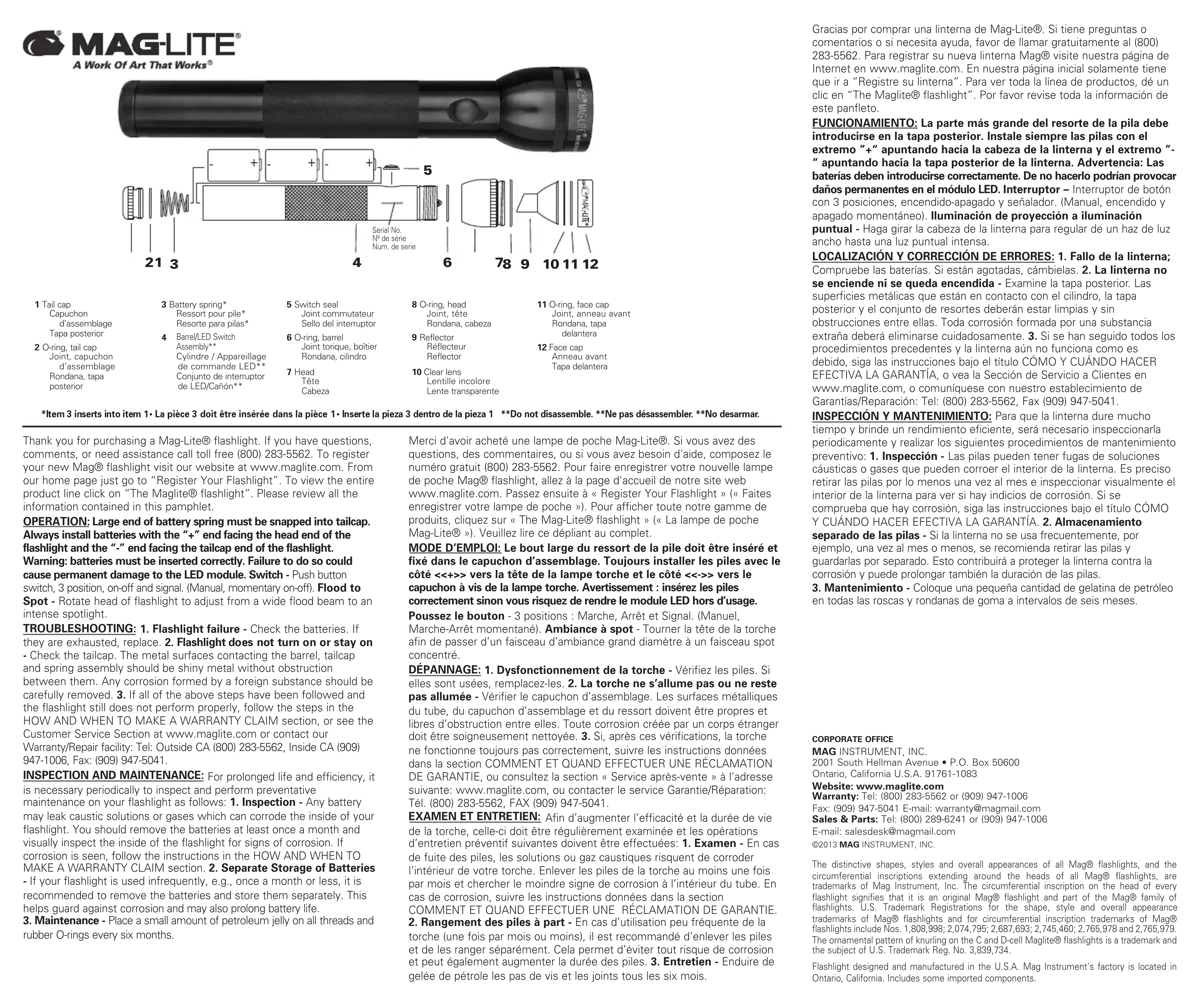 rubber O-rings every six months. Merci d'avoir acheté une lampe de poche Mag-Lite®. Si vous avez des questions, des commentaires, ou si vous avez besoin d'aide, composez le numéro gratuit (800) 283-5562. Pour faire enregistrer votre nouvelle lampe de poche Mag® flashlight, allez à la page d'accueil de notre site web www.maglite.com. Passez ensuite à « Register Your Flashlight » (« Faites enregistrer votre lampe de poche »). Pour afficher toute notre gamme de produits, cliquez sur « The Mag-Lite® flashlight » (« La lampe de poche Mag-Lite® »). Veuillez lire ce dépliant au complet. MODE D’EMPLOI: Le bout large du ressort de la pile doit être inséré et fixé dans le capuchon d’assemblage. Toujours installer les piles avec le côté <<+>> vers la tête de la lampe torche et le côté <<->> vers le capuchon à vis de la lampe torche. Avertissement : insérez les piles correctement sinon vous risquez de rendre le module LED hors d’usage. Poussez le bouton - 3 positions : Marche, Arrêt et Signal. (Manuel, Marche-Arrêt momentané). Ambiance à spot - Tourner la tête de la torche afin de passer d’un faisceau d’ambiance grand diamètre à un faisceau spot concentré. DÉPANNAGE: