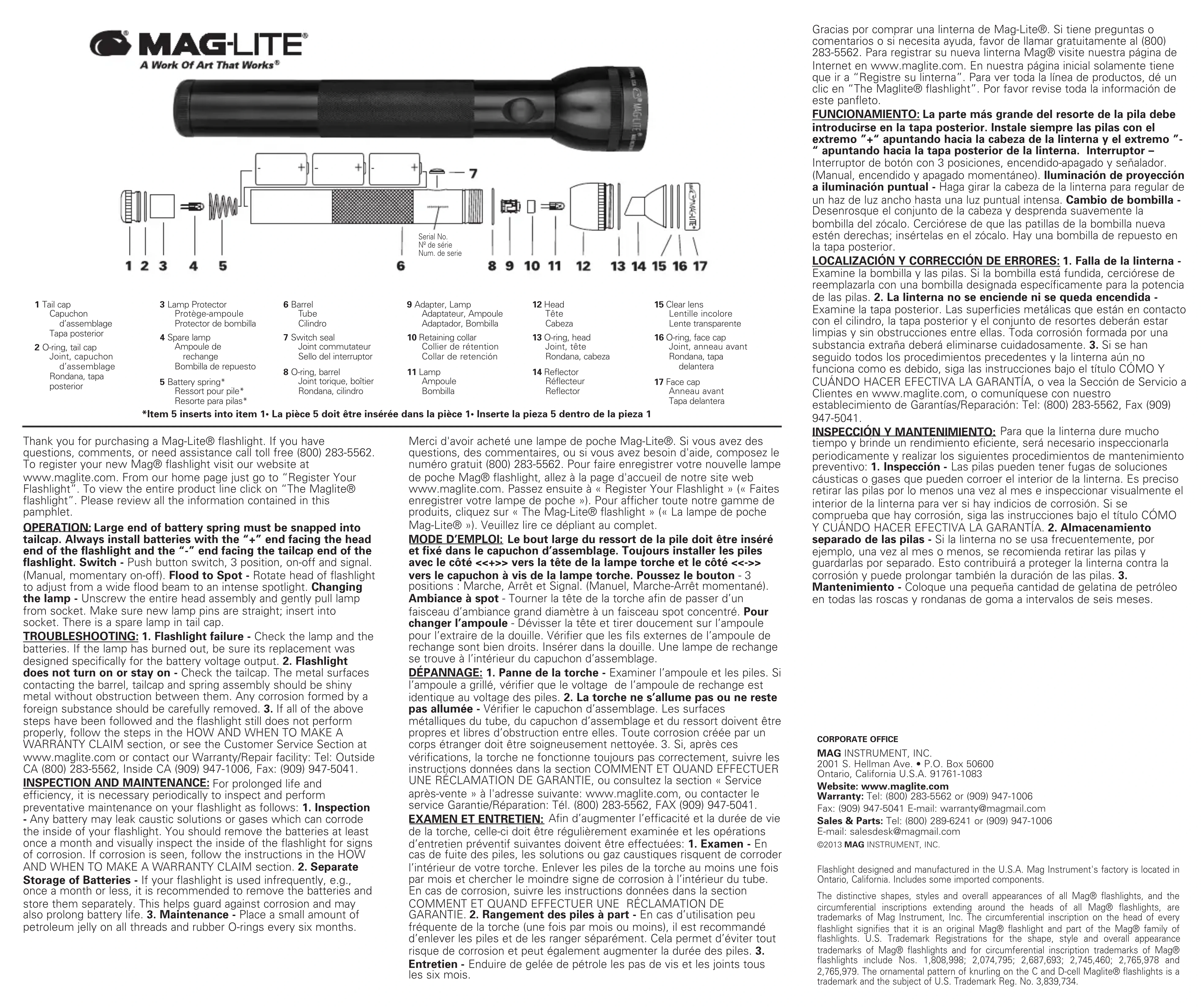 l’ampoule a grillé, vérifier que le voltage de l’ampoule de rechange est identique au voltage des piles. 2. La torche ne s’allume pas ou ne reste pas allumée - Vérifier le capuchon d’assemblage. Les surfaces métalliques du tube, du capuchon d’assemblage et du ressort doivent être propres et libres d’obstruction entre elles. Toute corrosion créée par un corps étranger doit être soigneusement nettoyée. 3. Si, après ces vérifications, la torche ne fonctionne toujours pas correctement, suivre les instructions données dans la section COMMENT ET QUAND EFFECTUER UNE RÉCLAMATION DE GARANTIE, ou consultez la section « Service après-vente » à l'adresse suivante: www.maglite.com, ou contacter le service Garantie/Réparation: Tél. (800) 283-5562, FAX (909) 947-5041. EXAMEN ET ENTRETIEN: Afin d’augmenter l’efficacité et la durée de vie de la torche, celle-ci doit être régulièrement examinée et les opérations d’entretien préventif suivantes doivent être effectuées: 1. Examen - En cas de fuite des piles, les solutions ou gaz caustiques risquent de corroder l’intérieur de votre torche. Enlever les piles de la torche au moins une fois par mois et chercher le moindre signe de corrosion à l’intérieur du tube. En cas de corrosion, suivre les instructions données dans la section COMMENT ET QUAND EFFECTUER UNE RÉCLAMATION DE GARANTIE. 2. Rangement des piles à part - En cas d’utilisation peu fréquente de la torche (une fois par mois ou moins), il est recommandé d’enlever les piles et de les ranger séparément. Cela permet d’éviter tout risque de corrosion et peut également augmenter la durée des piles. 3. Entretien - Enduire de gelée de pétrole les pas de vis et les joints tous les six mois. Gracias por comprar una linterna de Mag-Lite®. Si tiene preguntas o comentarios o si necesita ayuda, favor de llamar gratuitamente al (800) 283-5562. Para registrar su nueva linterna Mag® visite nuestra página de Internet en www.maglite.com. En nuestra página inicial solamente tiene que ir a “Registre su linterna”. Para ver toda la línea de productos, dé un clic en “The Maglite® flashlight”. Por favor revise toda la información de este panfleto. FUNCIONAMIENTO: La parte más grande del resorte de la pila debe introducirse en la tapa posterior. Instale siempre las pilas con el extremo ”+“ apuntando hacia la cabeza de la linterna y el extremo ”- “ apuntando hacia la tapa posterior de la linterna. Interruptor – Interruptor de botón con 3 posiciones, encendido-apagado y señalador. (Manual, encendido y apagado momentáneo). lluminación de proyección a iluminación puntual - Haga girar la cabeza de la linterna para regular de un haz de luz ancho hasta una luz puntual intensa. Cambio de bombilla - Desenrosque el conjunto de la cabeza y desprenda suavemente la bombilla del zócalo. Cerciórese de que las patillas de la bombilla nueva estén derechas; insértelas en el zócalo. Hay una bombilla de repuesto en la tapa posterior. LOCALIZACIÓN Y CORRECCIÓN DE ERRORES: