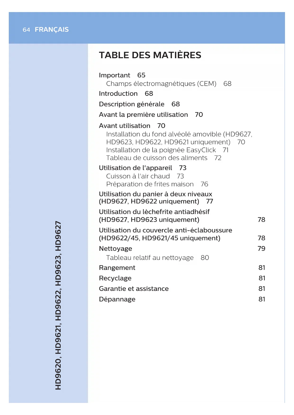 Important 65 Champs électromagnétiques (CEM) 68 Introduction 68 Description générale 68 Avant la première utilisation 70 Avant utilisation 70 Installation du fond alvéolé amovible (HD9627, HD9623, HD9622, HD9621 uniquement) 70 Installation de la poignée EasyClick 71 Tableau de cuisson des aliments 72 Utilisation de l'appareil 73 Cuisson à l'air chaud 73 Préparation de frites maison 76 Utilisation du panier à deux niveaux (HD9627, HD9622 uniquement) 77 Utilisation du lèchefrite antiadhésif (HD9627, HD9623 uniquement) 78 Utilisation du couvercle anti-éclaboussure (HD9622/45, HD9621/45 uniquement) 78 Nettoyage 79 Tableau relatif au nettoyage 80 Rangement 81 Recyclage 81 Garantie et assistance 81 Dépannage 81
