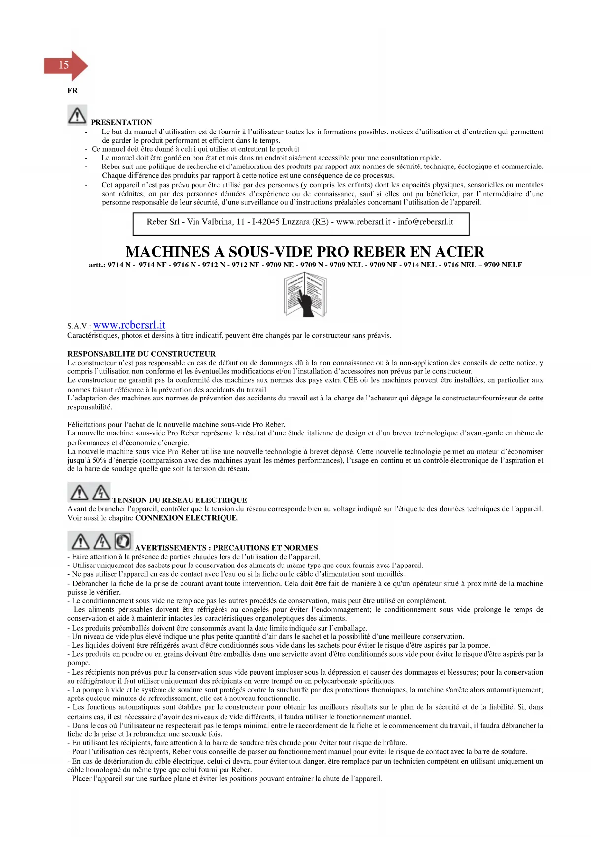 L'appareil est prévu et garanti pour l'utilisation avec des sacs de type gaufré de la marque Reber, l'utilisation avec des sacs d'autres types et/ou marques peut affecter le bon fonctionnement.