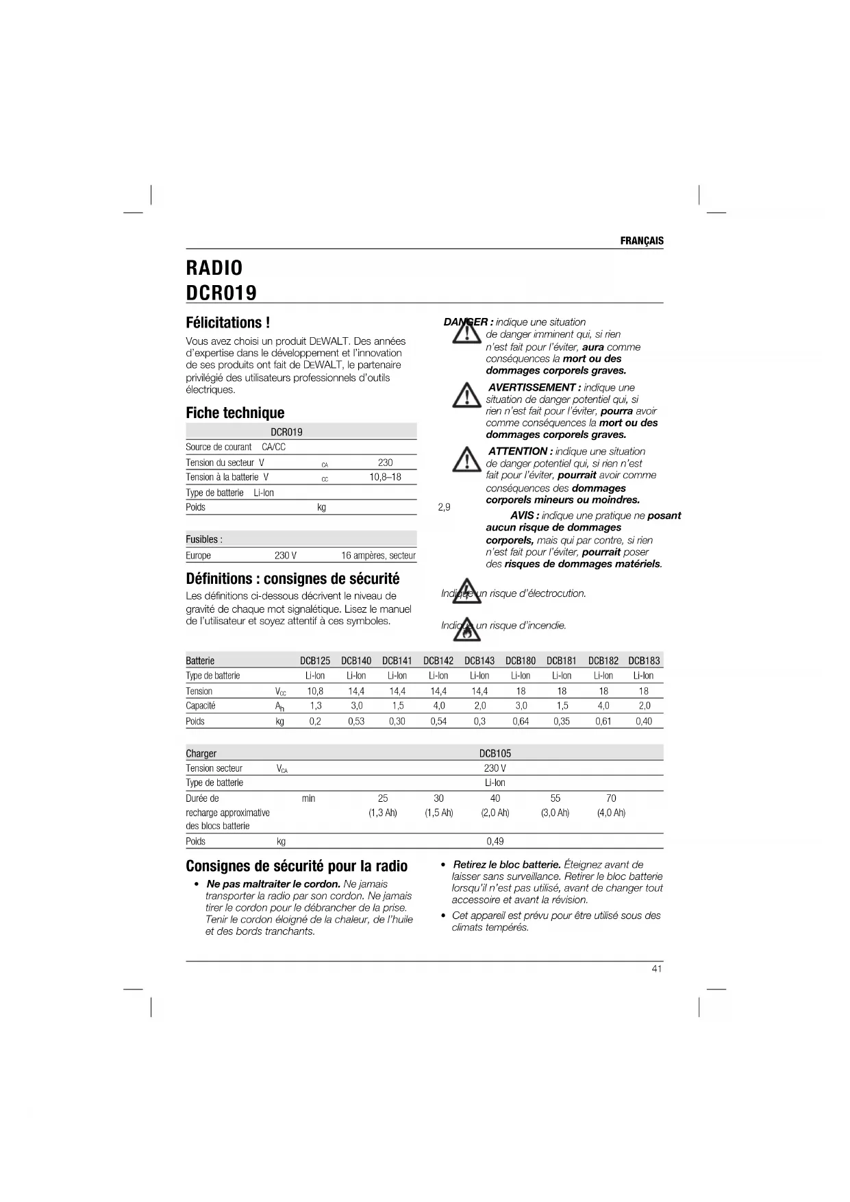 situation de danger potentiel qui, si rien n’est fait pour l’éviter, pourra avoir comme conséquences la mort ou des dommages corporels graves. ATTENTION: indique une situation de danger potentiel qui, si rien n’est fait pour l’éviter, pourrait avoir comme conséquences des dommages corporels mineurs ou moindres. AVIS: indique une pratique ne posant aucun risque de dommages corporels, mais qui par contre, si rien n’est fait pour l’éviter, pourrait poser des risques de dommages matériels. Indique un risque d’électrocution. Indique un risque d’incendie. Félicitations! Vous avez choisi un produit DEWALT. Des années d’expertise dans le développement et l’innovation de ses produits ont fait de D EWALT, le partenaire privilégié des utilisateurs professionnels d’outils électriques. Fiche technique DCR019 Source de courant CA/CC Tension du secteur V