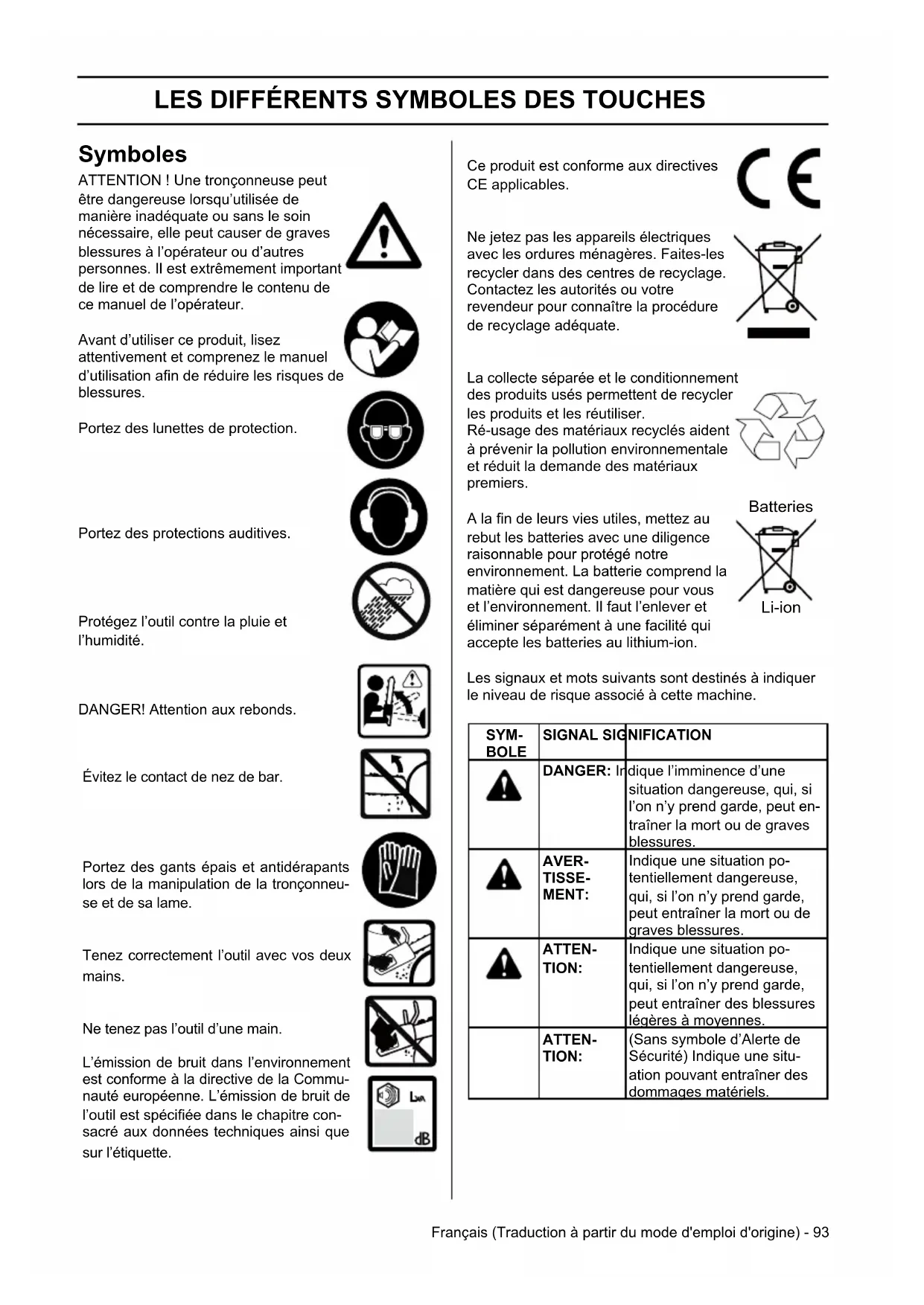 Symboles ATTENTION ! Une tronçonneuse peut être dangereuse lorsqu’utilisée de manière inadéquate ou sans le soin nécessaire, elle peut causer de graves blessures à l’opérateur ou d’autres personnes. Il est extrêmement important de lire et de comprendre le contenu de ce manuel de l’opérateur. Avant d’utiliser ce produit, lisez attentivement et comprenez le manuel d’utilisation afin de réduire les risques de blessures. Portez des lunettes de protection. Portez des protections auditives. Protégez l’outil contre la pluie et l’humidité. DANGER! Attention aux rebonds. Évitez le contact de nez de bar. Portez des gants épais et antidérapants lors de la manipulation de la tronçonneu- se et de sa lame. Tenez correctement l’outil avec vos deux mains. Ne tenez pas l’outil d’une main. L’émission de bruit dans l’environnement est conforme à la directive de la Commu- nauté européenne. L’émission de bruit de l’outil est spéciée dans le chapitre con- sacré aux données techniques ainsi que sur l’étiquette. Ce produit est conforme aux directives CE applicables. Ne jetez pas les appareils électriques avec les ordures ménagères. Faites-les recycler dans des centres de recyclage. Contactez les autorités ou votre revendeur pour connaître la procédure de recyclage adéquate. La collecte séparée et le conditionnement des produits usés permettent de recycler les produits et les réutiliser. Ré-usage des matériaux recyclés aident à prévenir la pollution environnementale et réduit la demande des matériaux premiers. A la fin de leurs vies utiles, mettez au rebut les batteries avec une diligence raisonnable pour protégé notre environnement. La batterie comprend la matière qui est dangereuse pour vous et l’environnement. Il faut l’enlever et éliminer séparément à une facilité qui accepte les batteries au lithium-ion. Les signaux et mots suivants sont destinés à indiquer le niveau de risque associé à cette machine. SYM- BOLE SIGNAL SIGNIFICATION