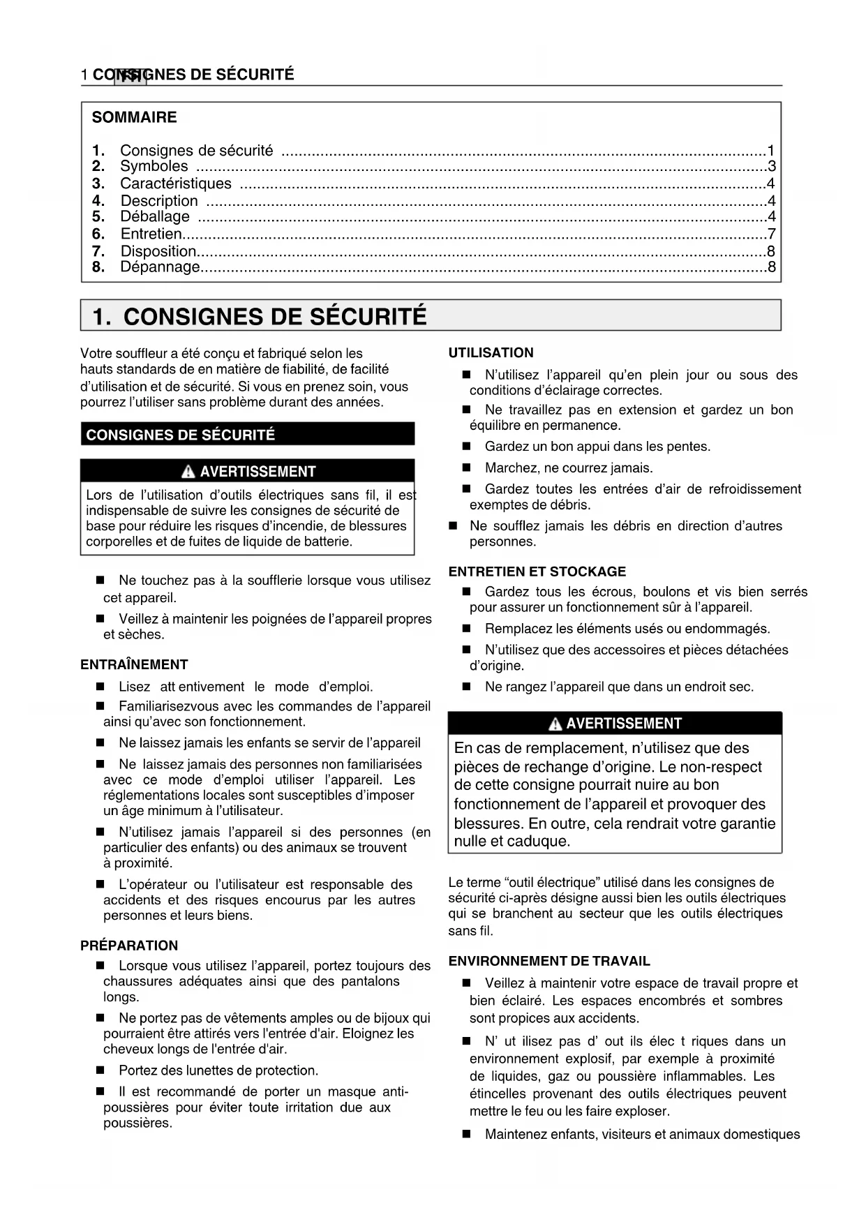 AVERTISSEMENT Lors de l’utilisation d’outils électriques sans l, il est indispensable de suivre les consignes de sécurité de base pour réduire les risques d’incendie, de blessures corporelles et de fuites de liquide de batterie. Ne touchez pas à la soufflerie lorsque vous utilisez cet appareil. Veillez à maintenir les poignées de l’appareil propres et sèches. ENTRAîNEMENT Lisez att entivement le mode d’emploi. Familiarisezvous avec les commandes de l’appareil ainsi qu’avec son fonctionnement. Ne laissez jamais les enfants se servir de l’appareil Ne laissez jamais des personnes non familiarisées avec ce mode d’emploi utiliser l’appareil. Les réglementations locales sont susceptibles d’imposer un âge minimum à l’utilisateur. N’utilisez jamais l’appareil si des personnes (en particulier des enfants) ou des animaux se trouvent à proximité. L’opérateur ou l’utilisateur est responsable des accidents et des risques encourus par les autres personnes et leurs biens. PRÉPARATION Lorsque vous utilisez l’appareil, portez toujours des chaussures adéquates ainsi que des pantalons longs. Ne portez pas de vêtements amples ou de bijoux qui pourraient être attirés vers l'entrée d'air. Eloignez les cheveux longs de l'entrée d'air. Portez des lunettes de protection. Il est recommandé de porter un masque anti- poussières pour éviter toute irritation due aux poussières. UTILISATION N’utilisez l’appareil qu’en plein jour ou sous des conditions d’éclairage correctes. Ne travaillez pas en extension et gardez un bon équilibre en permanence. Gardez un bon appui dans les pentes. Marchez, ne courrez jamais. Gardez toutes les entrées d’air de refroidissement exemptes de débris. Ne soufflez jamais les débris en direction d’autres personnes.