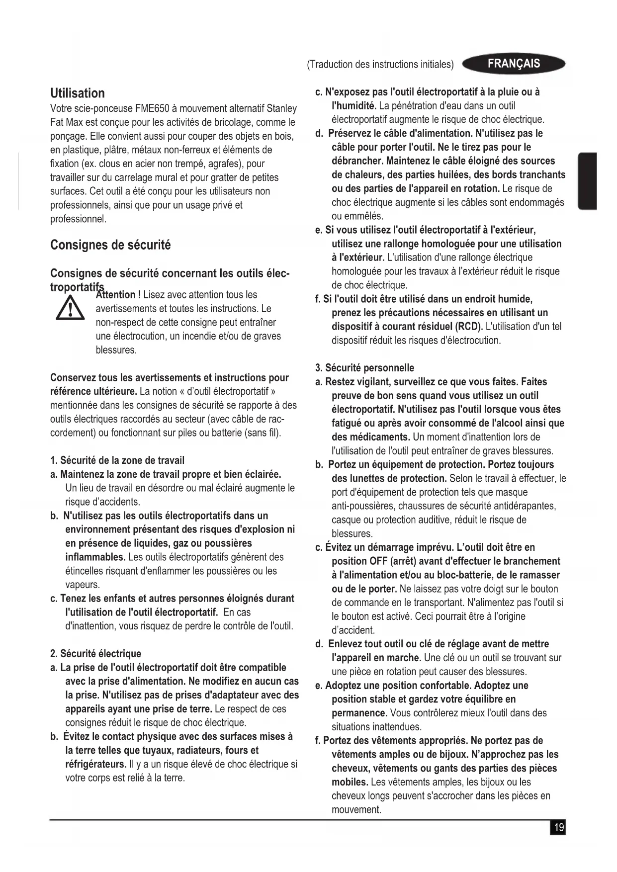 22,000 min-1. Mise en marche et arrêt (gure I) u Pour mettre l’outil en marche, glissez le bouton marche/ arrêt (1) vers l’avant (position I). u Pour éteindre l’outil, glissez le bouton marche/arrêt (1) vers l’arrière (position O). Guide de coupe (gure F et J) Cette option vous permet d'avoir un suivi plus précis le long de la ligne de coupe marquée. u Pour utiliser le guide de coupe, insérez le guide (13), comme indiqué gure J, dans la fente avant sur le bloc du guide de coupe/profondeur (8). u Réglez la longueur du guide en le tirant et le poussant pour atteindre la profondeur de coupe désirée. u Fixez le guide dans la position requise en tournant le bouton de réglage de coupe/profondeur (12) dans le sens des aiguilles d'une montre. Pour dégager le guide, tournez le bouton de réglage de coupe/profondeur dans le sens contraire des aiguilles d'une montre. Guide de coupe (gure F et K) Cette option vous permet de couper le matériel à une profon- deur précise. u Pour utiliser le guide de profondeur, insérez le guide (13), comme indiqué gure K, dans la fente avant sur le bloc du guide de coupe/profondeur (8). u Réglez la longueur du guide en le tirant et le poussant pour atteindre la profondeur de coupe désirée. u Fixez le guide dans la position requise en tournant le bouton de réglage de coupe/profondeur (12) dans le sens des aiguilles d'une montre. Pour dégager le guide, tournez le bouton de réglage de coupe/profondeur dans le sens contraire des aiguilles d'une montre.24 (Traduction des instructions initiales) FRANÇAIS Conseils pour une utilisation optimale u Maintenez toujours l’outil fermement. Pour un travail de précision, maintenez l’outil proche de l’avant. u Si possible serrez la pièce, surtout si des lames coupantes sont utilisées. u N'exercez pas trop de pression sur l'outil. u Utilisez toujours le type d’accessoire approprié correspon- dant au matériau de la pièce. u Vériez régulièrement l'état des accessoires. Remplacez- les lorsque cela s'avère nécessaire. u Repérez le point de départ désiré. u Mettez l’outil en marche et insérez lentement les acces- soires au niveau du point de départ sur la pièce. u Serrez un morceau de bois tendre ou de contreplaqué à l’arrière de la pièce et sciez l’ensemble pour obtenir une coupe nette. u Ne forcez pas la lame dans la pièce. Notez que la coupe de pièce en métal prend normalement plus de temps que celle de pièce en bois épais. u Pour couper du métal, étalez une ne couche d'huile le long de la ligne de coupe avant de commencer. u Lorsque vous poncez de nouvelles couches de peinture avant d'en appliquer une autre, utilisez un abrasif extra n. u Pour les surfaces irrégulières ou lorsque vous enlevez des couches de peinture, commencez par un abrasif à gros grains. Sur d'autres surfaces, commencez avec un abrasif moyen. Dans les deux cas, changez petit à petit de grain et passez à un abrasif n pour une nition lisse. u Renseignez-vous auprès de votre revendeur pour con- naître les accessoires disponibles. Entretien Votre appareil/outil sans l/avec l Stanley Fat Max a été conçu pour fonctionner pendant longtemps avec un minimum d'entretien. Un fonctionnement continu satisfaisant dépend d'un nettoyage régulier et d'un entretien approprié de l'outil. Attention ! À ne pas oublier avant l’entretien des appareils électriques sans l/avec l : u Arrêtez l’appareil/outil, puis débranchez-le. u Ou, arrêtez l’appareil et retirez la batterie de l’appareil/outil si celui-ci est muni d’un bloc-batterie séparé. u Ou bien déchargez complètement la batterie si elle est intégrée au système, puis arrêtez l’appareil (position Off). u Nettoyez régulièrement les orices de ventilation de votre appareil/outil/chargeur à l'aide d'une brosse souple ou d'un chiffon sec. u Nettoyez régulièrement le compartiment du moteur à l'aide d'un chiffon humide. N'utilisez pas de produit abrasif ou à base de solvant. Remplacement des prises secteur (RU et Irlande uniquement) Si une nouvelle prise secteur doit être installée : u Mettez au rebut la vieille prise. u Branchez le l brun dans la borne de la nouvelle prise. u Branchez le l bleu à la borne neutre. Attention ! Aucune connexion ne doit être faite à la borne de terre. Suivez les instructions de montage fournies avec les prises de bonne qualité. Fusibles recommandés : 5 A. Protection de l'environnement