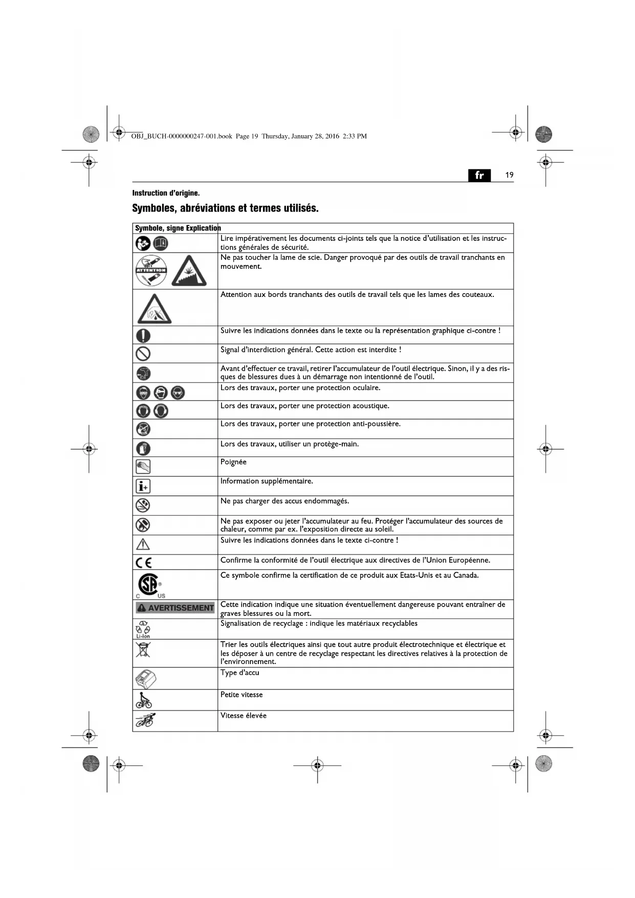 Instruction d’origine. Symboles, abréviations et termes utilisés. Symbole, signe Explication Lire impérativement les documents ci-joints tels que la notice d’utilisation et les instruc- tions générales de sécurité. Ne pas toucher la lame de scie. Danger provoqué par des outils de travail tranchants en mouvement. Attention aux bords tranchants des outils de travail tels que les lames des couteaux. Suivre les indications données dans le texte ou la représentation graphique ci-contre ! Signal d’interdiction général. Cette action est interdite ! Avant d’effectuer ce travail, retirer l’accumulateur de l’outil électrique. Sinon, il y a des ris- ques de blessures dues à un démarrage non intentionné de l’outil. Lors des travaux, porter une protection oculaire. Lors des travaux, porter une protection acoustique. Lors des travaux, porter une protection anti-poussière. Lors des travaux, utiliser un protège-main. Poignée Information supplémentaire. Ne pas charger des accus endommagés. Ne pas exposer ou jeter l’accumulateur au feu. Protéger l’accumulateur des sources de chaleur, comme par ex. l’exposition directe au soleil. Suivre les indications données dans le texte ci-contre ! Confirme la conformité de l’outil électrique aux directives de l’Union Européenne. Ce symbole confirme la certification de ce produit aux Etats-Unis et au Canada. Cette indication indique une situation éventuellement dangereuse pouvant entraîner de graves blessures ou la mort. Signalisation de recyclage : indique les matériaux recyclables Trier les outils électriques ainsi que tout autre produit électrotechnique et électrique et les déposer à un centre de recyclage respectant les directives relatives à la protection de l’environnement. Type d’accu Petite vitesse Vitesse élevée AVERTISSEMENT OBJ_BUCH-0000000247-001.book Page 19 Thursday, January 28, 2016 2:33 PM20