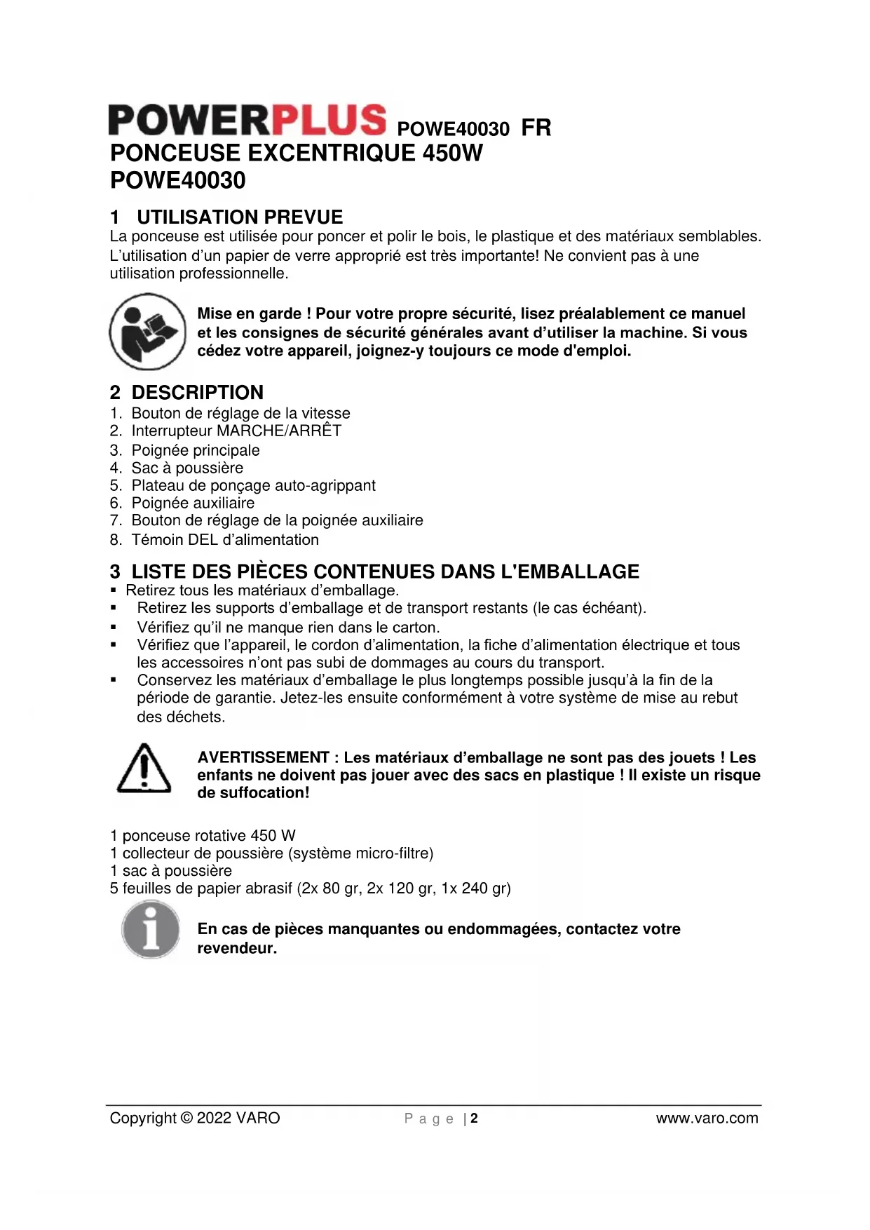 enfants ne doivent pas jouer avec des sacs en plastique ! Il existe un risque de suffocation! 1 ponceuse rotative 450 W 1 collecteur de poussière (système micro-filtre) 1 sac à poussière 5 feuilles de papier abrasif (2x 80 gr, 2x 120 gr, 1x 240 gr) En cas de pièces manquantes ou endommagées, contactez votre revendeur.POWE40030 FR Copyright © 2022 VARO P a g e | 3 www.varo.com 4 PICTOGRAMMES Les symboles suivants sont utilisés dans ce mode d’emploi et/ou sur la machine :