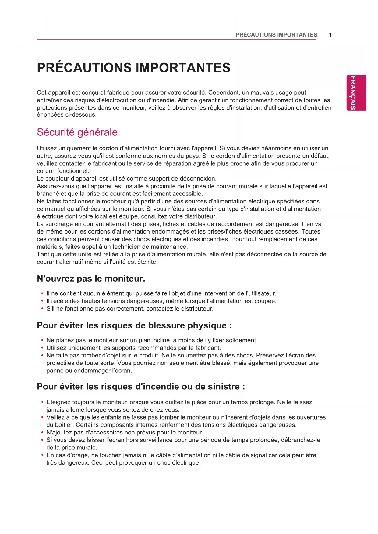 Éteignez toujours le moniteur lorsque vous quittez la pièce pour un temps prolongé. Ne le laissez jamais allumé lorsque vous sortez de chez vous. Veillez à ce que les enfants ne fasse pas tomber le moniteur ou n'insèrent d'objets dans les ouvertures du boîtier. Certains composants internes renferment des tensions électriques dangereuses. N'ajoutez pas d'accessoires non prévus pour le moniteur. Si vous devez laisser l'écran hors surveillance pour une période de temps prolongée, débranchez-le de la prise murale. En cas d’orage, ne touchez jamais ni le câble d’alimentation ni le câble de signal car cela peut être très dangereux. Ceci peut provoquer un choc électrique.2 ENG FRANÇAIS