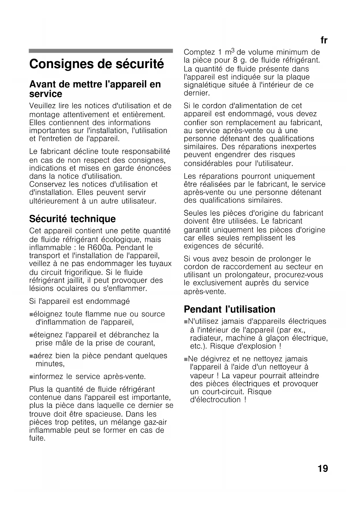 Consignes de sécurité Avant de mettre l'appareil en service Veuillez lire les notices d'utilisation et de montage attentivement et entièrement. Elles contiennent des informations importantes sur l'installation, l'utilisation et l'entretien de l'appareil. Le fabricant décline toute responsabilité en cas de non respect des consignes, indications et mises en garde énoncées dans la notice d'utilisation. Conservez les notices d'utilisation et d'installation. Elles peuvent servir ultérieurement à un autre utilisateur. Sécurité technique Cet appareil contient une petite quantité de fluide réfrigérant écologique, mais inflammable : le R600a. Pendant le transport et l'installation de l'appareil, veillez à ne pas endommager les tuyaux du circuit frigorifique. Si le fluide réfrigérant jaillit, il peut provoquer des lésions oculaires ou s'enflammer. Si l'appareil est endommagé n éloignez toute flamme nue ou source d'inflammation de l'appareil, n éteignez l'appareil et débranchez la prise mâle de la prise de courant, n aérez bien la pièce pendant quelques minutes, n informez le service après-vente. Plus la quantité de fluide réfrigérant contenue dans l'appareil est importante, plus la pièce dans laquelle ce dernier se trouve doit être spacieuse. Dans les pièces trop petites, un mélange gaz-air inflammable peut se former en cas de fuite. Comptez 1 m