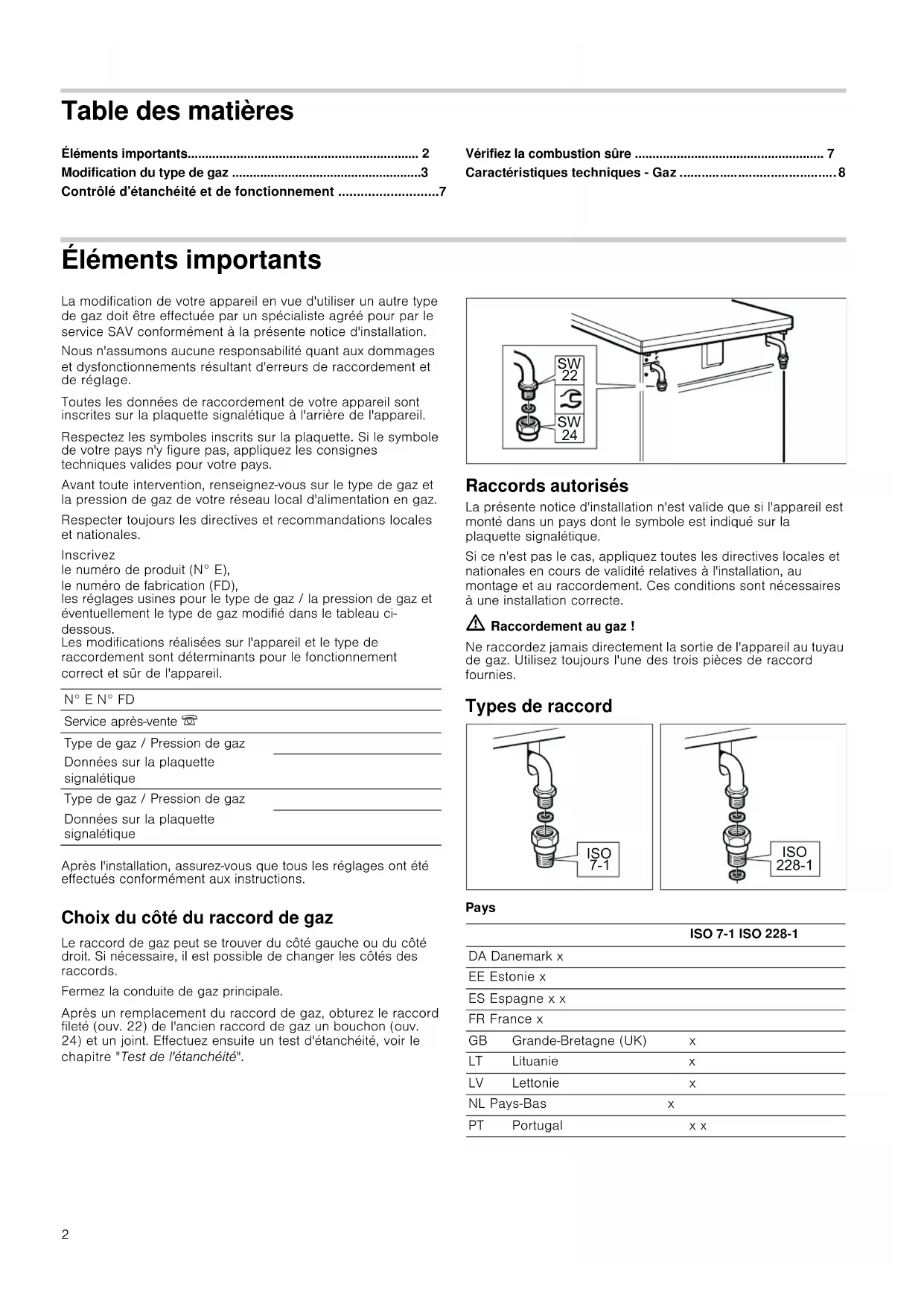- Caractéristiques techniques Gaz Éléments importants La modification de votre appareil en vue d'utiliser un autre type de gaz doit être effectuée par un spécialiste agréé pour par le service SAV conformément à la présente notice d'installation.Nous n'assumons aucune responsabilité quant aux dommages et dysfonctionnements résultant d'erreurs de raccordement et de réglage.Toutes les données de raccordement de votre appareil sont inscrites sur la plaquette signalétique à l'arrière de l'appareil.Respectez les symboles inscrits sur la plaquette. Si le symbole de votre pays n'y figure pas, appliquez les consignes techniques valides pour votre pays.Avant toute intervention, renseignez-vous sur le type de gaz et la pression de gaz de votre réseau local d'alimentation en gaz.Respecter toujours les directives et recommandations locales et nationales.Inscrivez le numéro de produit (N° E), le numéro de fabrication (FD), les réglages usines pour le type de gaz / la pression de gaz et éventuellement le type de gaz modifié dans le tableau ci-dessous. Les modifications réalisées sur l'appareil et le type de raccordement sont déterminants pour le fonctionnement correct et sûr de l'appareil.Après l'installation, assurez-vous que tous les réglages ont été effectués conformément aux instructions. Choix du côté du raccord de gaz Le raccord de gaz peut se trouver du côté gauche ou du côté droit. Si nécessaire, il est possible de changer les côtés des raccords.Fermez la conduite de gaz principale.Après un remplacement du raccord de gaz, obturez le raccord fileté (ouv. 22) de l'ancien raccord de gaz un bouchon (ouv. 24) et un joint. Effectuez ensuite un test d'étanchéité, voir le chapitre "Test de l'étanchéité". Raccords autorisés La présente notice d'installation n'est valide que si l'appareil est monté dans un pays dont le symbole est indiqué sur la plaquette signalétique.Si ce n'est pas le cas, appliquez toutes les directives locales et nationales en cours de validité relatives à l'installation, au montage et au raccordement. Ces conditions sont nécessaires à une installation correcte. ã=Raccordement au gaz ! Ne raccordez jamais directement la sortie de l'appareil au tuyau de gaz. Utilisez toujours l'une des trois pièces de raccord fournies. Types de raccord Pays N° E N° FDService après-vente Type de gaz / Pression de gazDonnées sur la plaquette signalétiqueType de gaz / Pression de gazDonnées sur la plaquette signalétiqueISO 7-1 ISO 228-1DA Danemark xEE Estonie xES Espagne x xFR France xGB Grande-Bretagne (UK) xLT Lituanie xLV Lettonie xNL Pays-Bas xPT Portugal x x p. 8