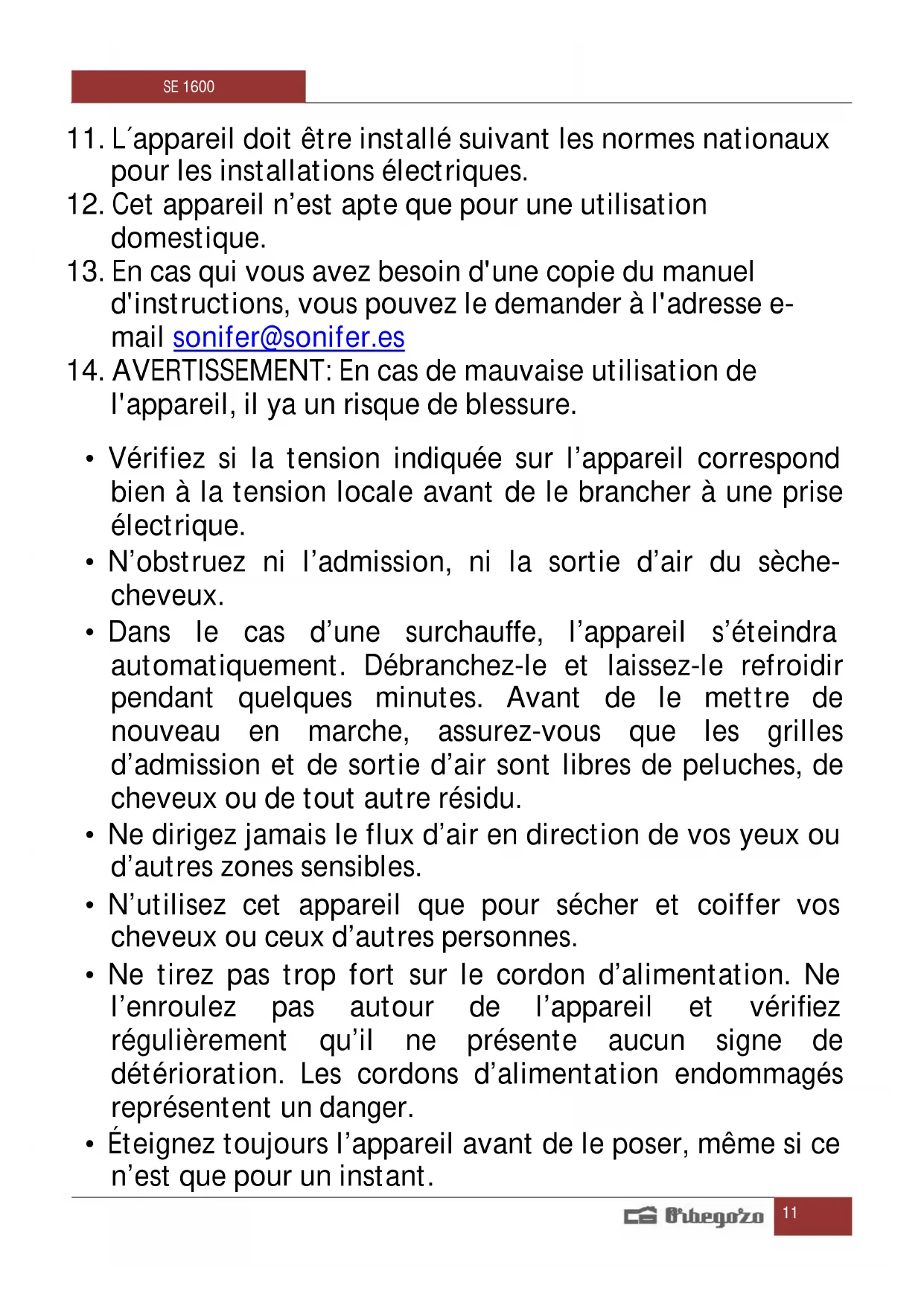 MODE D'EMPLOI SE 1600 Orbegozo