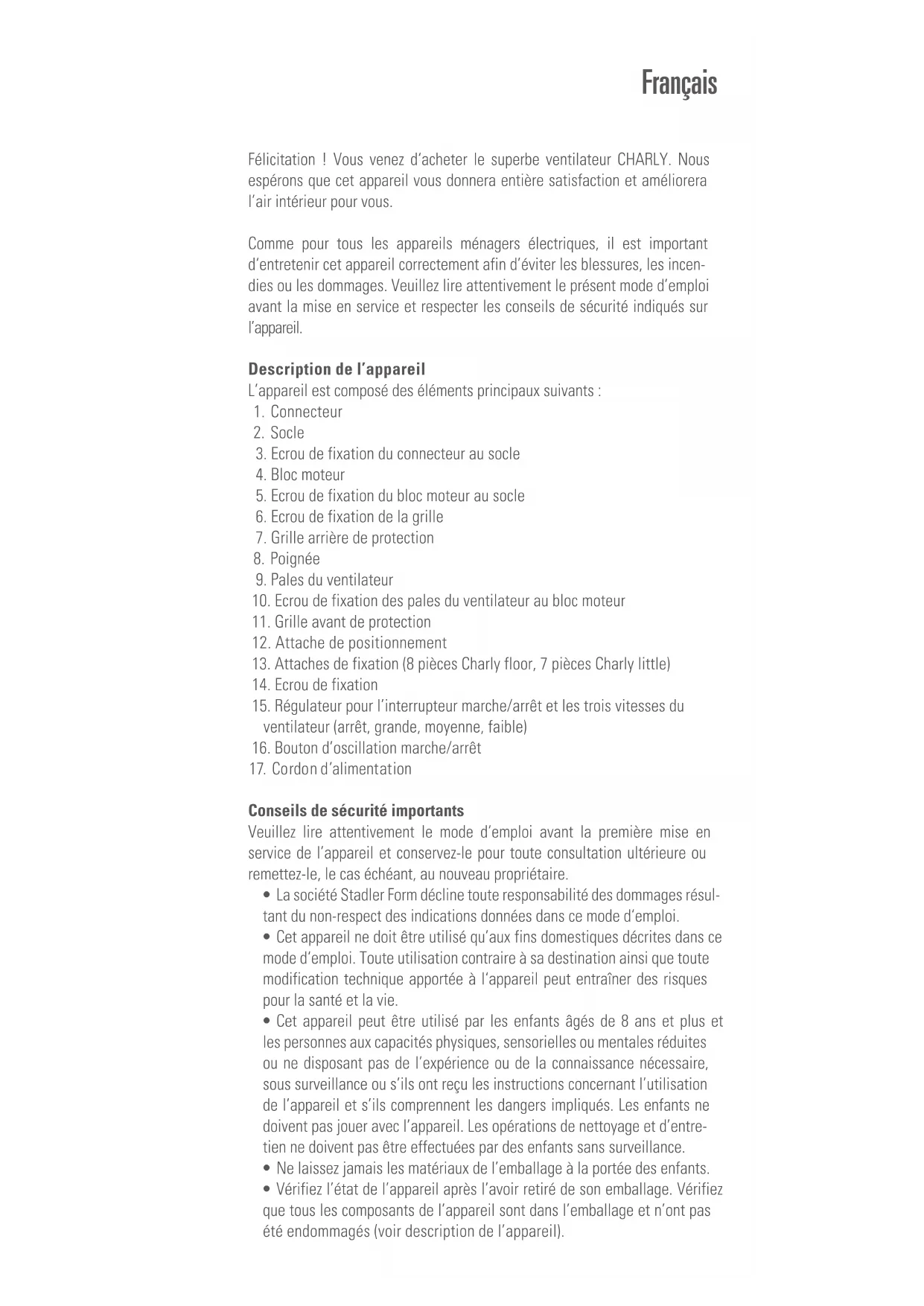- La société Stadler Form décline toute responsabilité des dommages résul- tant du non-respect des indications données dans ce mode d‘emploi.