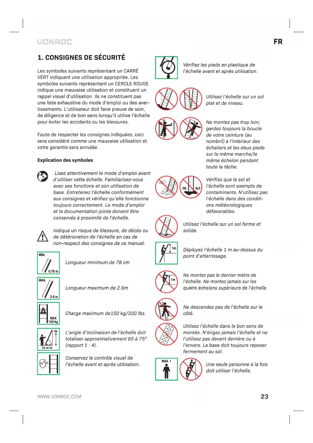 Les symboles suivants représentant un CARRÉ VERT indiquent une utilisation appropriée. Les symboles suivants représentant un CERCLE ROUGE indique une mauvaise utilisation et constituent un rappel visuel d’utilisation. Ils ne constituent pas une liste exhaustive du mode d’emploi ou des aver- tissements. L’utilisateur doit faire preuve de soin, de diligence et de bon sens lorsqu’il utilise l’échelle pour éviter les accidents ou les blessures. Faute de respecter les consignes indiquées, ceci sera considéré comme une mauvaise utilisation et votre garantie sera annulée. Explication des symboles Lisez attentivement le mode d’emploi avant d’utiliser cette échelle. Familiarisez-vous avec ses fonctions et son utilisation de base. Entretenez l’échelle conformément aux consignes et vérifiez qu’elle fonctionne toujours correctement. Le mode d’emploi et la documentation jointe doivent être conservés à proximité de l’échelle. Indique un risque de blessure, de décès ou de détérioration de l’échelle en cas de non-respect des consignes de ce manuel. Longueur minimum de 78 cm Longueur maximum de 2.6m Charge maximum de150 kg/330 lbs. L’angle d’inclinaison de l’échelle doit totaliser approximativement 65 à 75° (rapport 1 : 4). Conservez le contrôle visuel de l’échelle avant et après utilisation. Vérifiez les pieds en plastique de l’échelle avant et après utilisation.