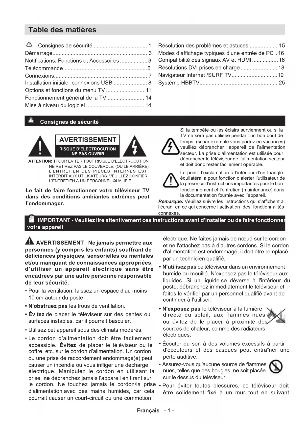 - Écouter du son à des volumes excessifs à partir d'écouteurs et de casques peut entraîner une perte auditive. Assurez-vous qu'aucune source de flammes nues, telles que des bougies, ne soit placée sur le dessus du téléviseur.