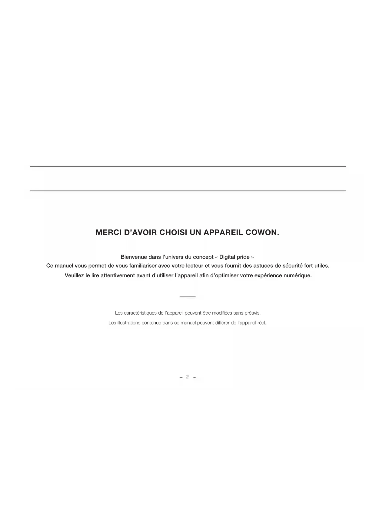 Les caractéristiques de l’appareil peuvent être modifiées sans préavis. Les illustrations contenue dans ce manuel peuvent différer de l’appareil réel. MERCI D’AVOIR CHOISI UN APPAREIL COWON. Bienvenue dans l’univers du concept « Digital pride » Ce manuel vous permet de vous familiariser avec votre lecteur et vous fournit des astuces de sécurité fort utiles. Veuillez le lire attentivement avant d’utiliser l’appareil afin d’optimiser votre expérience numérique.3 Site Web de COWON + Vous trouverez des détails supplémentaires sur le lecteur PLENUE J et d’autres produits COWON en consultant l’adresse suivante : http://www. COWON.com. + Vous pouvez consulter les dernières actualités de l’entreprise et télécharger gratuitement la dernière version du micrologiciel sur notre site internet. + Nous proposons une Foire aux questions et un manuel de l’utilisateur en ligne à l’intention des utilisateurs débutants. + Rejoignez-nous et enregistrez-vous comme membre en saisissant sur notre site Internet le numéro de série figurant à l’arrière de votre appareil. + En tant que membre, vous pouvez bénéficier de consultations directes en ligne et être informé par courrier électronique des actualités et des événements récents. Généralités + COWON® et PLENUE® sont des marques déposées de notre société et/ou de ses affiliés. + Les droits d’auteur de ce manuel appartiennent à notre société. Toute reproduction ou distribution non autorisée de son contenu, complète ou partielle, est strictement interdite. + Notre société respecte les lois Music Industry Promotion Act, Game Industry Promotion Act et Video Industry Promotion Act, ainsi que toutes les autres lois et réglementations applicables. Les utilisateurs sont également encouragés à respecter ces lois et ces réglementations. + Rendez-vous sur notre site http://www.COWON.com et rejoignez-nous en tant que membre. Vous pourrez alors bénéficier d’avantages réservés uniquement aux membres enregistrés. + Les illustrations, graphiques, photos et spécifications du produit contenus dans ce manuel peuvent faire l’objet de modifications ou de mises à jour sans préavis. À propos de BBE + Cet appareil est produit sous la licence de BBE Sound, Inc. (USP4638258, 5510752 et 5736897). + BBE et les symboles BBE sont des marques déposées de BBE Sound, Inc. COPYRIGHT NOTICE4 Utilisation de l’appareil 14 Écran de lecture Sélection des musiques Paramètres audio Paramètres détaillés Informations supplémentaires 20 Spécifications du produit Dépannage 22 Avant de commencer! 5 Précautions Contenu de l’emballage Noms des pièces et fonctions Touches Utilisation de base 10 Raccordement / Charge Branchement et débranchement de l’ordinateur Insertion et retrait de la carte micro SD Mise à jour du micrologiciel SOMMAIRE5 + N’utilisez pas cet appareil à des fins autres que celles décrites dans ce manuel. + Manipulez le manuel, l’emballage, les accessoires, etc. avec précaution afin d’éviter toute coupure ou blessure corporelle. + Pour votre sécurité, ne regardez pas de vidéos, d’images ou de textes enregistrés dans votre lecteur en conduisant. L’utilisation des autres fonctions de cet appareil pendant la conduite de votre véhicule comporte également des risques et peut entraîner des accidents mortels. + L’utilisation des écouteurs alors que vous êtes au volant d’un véhicule, que vous faites de l’exercice ou que vous êtes en promenade peut affecter la conduite, gêner ou empêcher la reconnaissance des signaux d’urgence, des alarmes, des avertissements, de l’approche d’un véhicule et de la conversation. L’utilisation des écouteurs peut également être interdite par la loi en fonction de la région dans laquelle vous vous trouvez. + N’utilisez pas de détergent ou d’autres produits chimiques sur la surface du produit tel qu’il mai responsables de la décoloration. Dans ce cas, nettoyez la zone polluée soigneusement avec un chiffon doux. + N’exposez pas votre appareil à des températures inférieures à 0°C ou supérieures à 40°C, comme ce peut être le cas à l’intérieur de votre véhicule. Votre appareil risquerait d’être irrémédiablement endommagé. PRÉCAUTIONS Avant de commencer ! Notre société ne peut être tenu responsable en cas de dommages ou de dysfonctionnements des produits suite à une mauvaise utilisation et au non-respect des instructions décrites dans le présent manuel. Les informations suivantes s’appliquent à tous les articles fabriqués ou produits par notre société. + Évitez de mettre votre lecteur en contact avec l’eau et ne le rangez pas dans un endroit humide pendant des périodes de temps prolongées. Si le lecteur est endommagé par la moisissure de la manière décrite précédemment, la défaillance du produit sera considérée comme étant causée par une mauvaise utilisation de la part de l’utilisateur. + Prendre soin de ne pas appliquer un choc extérieur ou de la pression lors de l’utilisation des produits avec d’écrans (LCD, AMOLED, ou Touch Pad). Garantie peut être annulée si le dommage se produit en raison des circonstances précitées. + Ne tentez jamais de démonter vous-même votre lecteur. Toute tentative de démontage annule la garantie et élimine toute possibilité de réparation ultérieure du produit au titre de la garantie. + Prenez garde à raccorder les câbles correctement entre votre lecteur et votre ordinateur. Vous risqueriez d’endommager vos deux appareils. Ne posez pas d’objets lourds sur les câbles et ne les pliez pas. + Veillez à ne pas charger le produit à proximité d’un appareil de chauffage ou dans un environnement aux températures élevées. Pour minimiser le risque de dégâts ou d’incendie, ne couvrez jamais l’appareil avec d’autres objets (couverture, serviette, etc.) et n’empêchez pas la dissipation naturelle de la ch