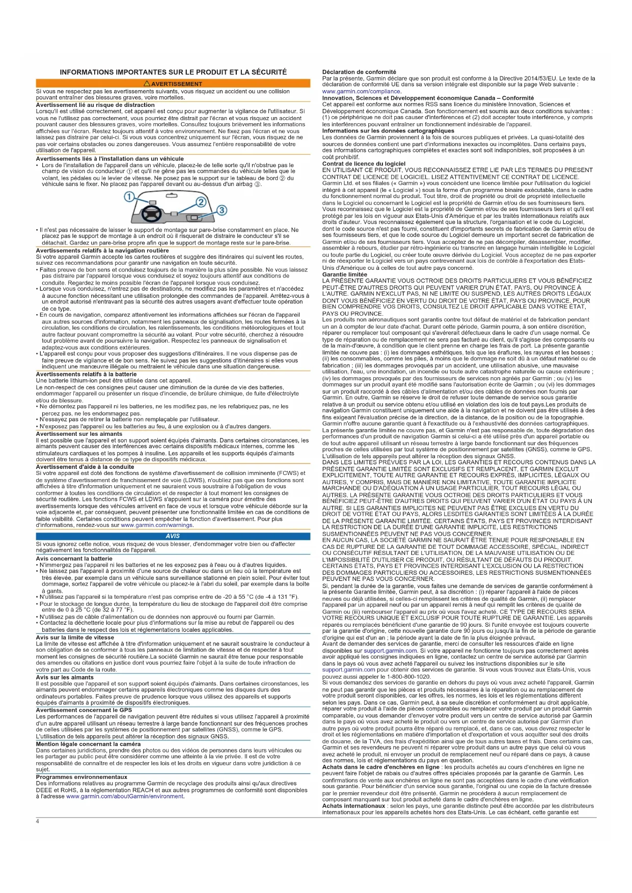 - Contactez la déchetterie locale pour plus d'informations sur la mise au rebut de l'appareil ou des batteries dans le respect des lois et réglementations locales applicables. Avis sur la limite de vitesse La limite de vitesse est affichée à titre d'information uniquement et ne saurait soustraire le conducteur à son obligation de se conformer à tous les panneaux de limitation de vitesse et de respecter à tout moment les consignes de sécurité routière.La société Garmin ne saurait être tenue pour responsable des amendes ou citations en justice dont vous pourriez faire l'objet à la suite de toute infraction de votre part au Code de la route. Avis sur les aimants Il est possible que l'appareil et son support soient équipés d'aimants. Dans certaines circonstances, les aimants peuvent endommager certains appareils électroniques comme les disques durs des ordinateurs portables. Faites preuve de prudence lorsque vous utilisez des appareils et supports équipés d'aimants à proximité de dispositifs électroniques. Avertissement concernant le GPS Les performances de l'appareil de navigation peuvent être réduites si vous utilisez l'appareil à proximité d'un autre appareil utilisant un réseau terrestre à large bande fonctionnant sur des fréquences proches de celles utilisées par les systèmes de positionnement par satellites (GNSS), comme le GPS. L'utilisation de tels appareils peut altérer la réception des signaux GNSS. Mention légale concernant la caméra Dans certaines juridictions, prendre des photos ou des vidéos de personnes dans leurs véhicules ou les partager au public peut être considérer comme une atteinte à la vie privée. Il est de votre responsabilité de connaître et de respecter les lois et les droits en vigueur dans votre juridiction à ce sujet. Programmes environnementaux Des informations relatives au programme Garmin de recyclage des produits ainsi qu'aux directives DEEE et RoHS, à la réglementation REACH et aux autres programmes de conformité sont disponibles à l'adresse www.garmin.com/aboutGarmin/environment. Déclaration de conformité Par la présente, Garmin déclare que son produit est conforme à la Directive 2014/53/EU. Le texte de la déclaration de conformité UE dans sa version intégrale est disponible sur la page Web suivante : www.garmin.com/compliance. Innovation, Sciences et Développement économique Canada – Conformité Cet appareil est conforme aux normes RSS sans licence du ministère Innovation, Sciences et Développement économique Canada. Son fonctionnement est soumis aux deux conditions suivantes : (1) ce périphérique ne doit pas causer d'interférences et (2) doit accepter toute interférence, y compris les interférences pouvant entraîner un fonctionnement indésirable de l'appareil. Informations sur les données cartographiques Les données de Garmin proviennent à la fois de sources publiques et privées. La quasi-totalité des sources de données contient une part d'informations inexactes ou incomplètes. Dans certains pays, des informations cartographiques complètes et exactes sont soit indisponibles, soit proposées à un coût prohibitif. Contrat de licence du logiciel EN UTILISANT CE PRODUIT, VOUS RECONNAISSEZ ETRE LIE PAR LES TERMES DU PRESENT CONTRAT DE LICENCE DE LOGICIEL. LISEZ ATTENTIVEMENT CE CONTRAT DE LICENCE. Garmin Ltd. et ses filiales (« Garmin ») vous concèdent une licence limitée pour l'utilisation du logiciel intégré à cet appareil (le « Logiciel ») sous la forme d'un programme binaire exécutable, dans le cadre du fonctionnement normal du produit. Tout titre, droit de propriété ou droit de propriété intellectuelle dans le Logiciel ou concernant le Logiciel est la propriété de Garmin et/ou de ses fournisseurs tiers. Vous reconnaissez que le Logiciel est la propriété de Garmin et/ou de ses fournisseurs tiers et qu'il est protégé par les lois en vigueur aux Etats-Unis d'Amérique et par les traités internationaux relatifs aux droits d'auteur. Vous reconnaissez également que la structure, l'organisation et le code du Logiciel, dont le code source n'est pas fourni, constituent d'importants secrets de fabrication de Garmin et/ou de ses fournisseurs tiers, et que le code source du Logiciel demeure un important secret de fabrication de Garmin et/ou de ses fournisseurs tiers. Vous acceptez de ne pas décompiler, désassembler, modifier, assembler à rebours, étudier par rétro-ingénierie ou transcrire en langage humain intelligible le Logiciel ou toute partie du Logiciel, ou créer toute œuvre dérivée du Logiciel. Vous acceptez de ne pas exporter ni de réexporter le Logiciel vers un pays contrevenant aux lois de contrôle à l'exportation des Etats- Unis d'Amérique ou à celles de tout autre pays concerné. Garantie limitée LA PRÉSENTE GARANTIE VOUS OCTROIE DES DROITS PARTICULIERS ET VOUS BÉNÉFICIEZ PEUT-ÊTRE D'AUTRES DROITS QUI PEUVENT VARIER D'UN ÉTAT, PAYS, OU PROVINCE À L'AUTRE. GARMIN N'EXCLUT PAS, NI NE LIMITE OU SUSPEND, LES AUTRES DROITS LÉGAUX DONT VOUS BÉNÉFICIEZ EN VERTU DU DROIT DE VOTRE ÉTAT, PAYS OU PROVINCE. POUR BIEN COMPRENDRE VOS DROITS, CONSULTEZ LE DROIT APPLICABLE DANS VOTRE ÉTAT, PAYS OU PROVINCE. Les produits non aéronautiques sont garantis contre tout défaut de matériel et de fabrication pendant un an à compter de leur date d'achat. Durant cette période, Garmin pourra, à son entière discrétion, réparer ou remplacer tout composant qui s'avérerait défectueux dans le cadre d'un usage normal. Ce type de réparation ou de remplacement ne sera pas facturé au client, qu'il s'agisse des composants ou de la main-d'œuvre, à condition que le client prenne en charge les frais de port. La présente garantie limitée ne couvre pas : (i) les dommages esthétiques, tels que les éraflures, les rayures et les bosses ; (ii) les consommables, comme les piles, à moins que le dommage ne soit dû à un défaut matériel ou de fabrication ; 
