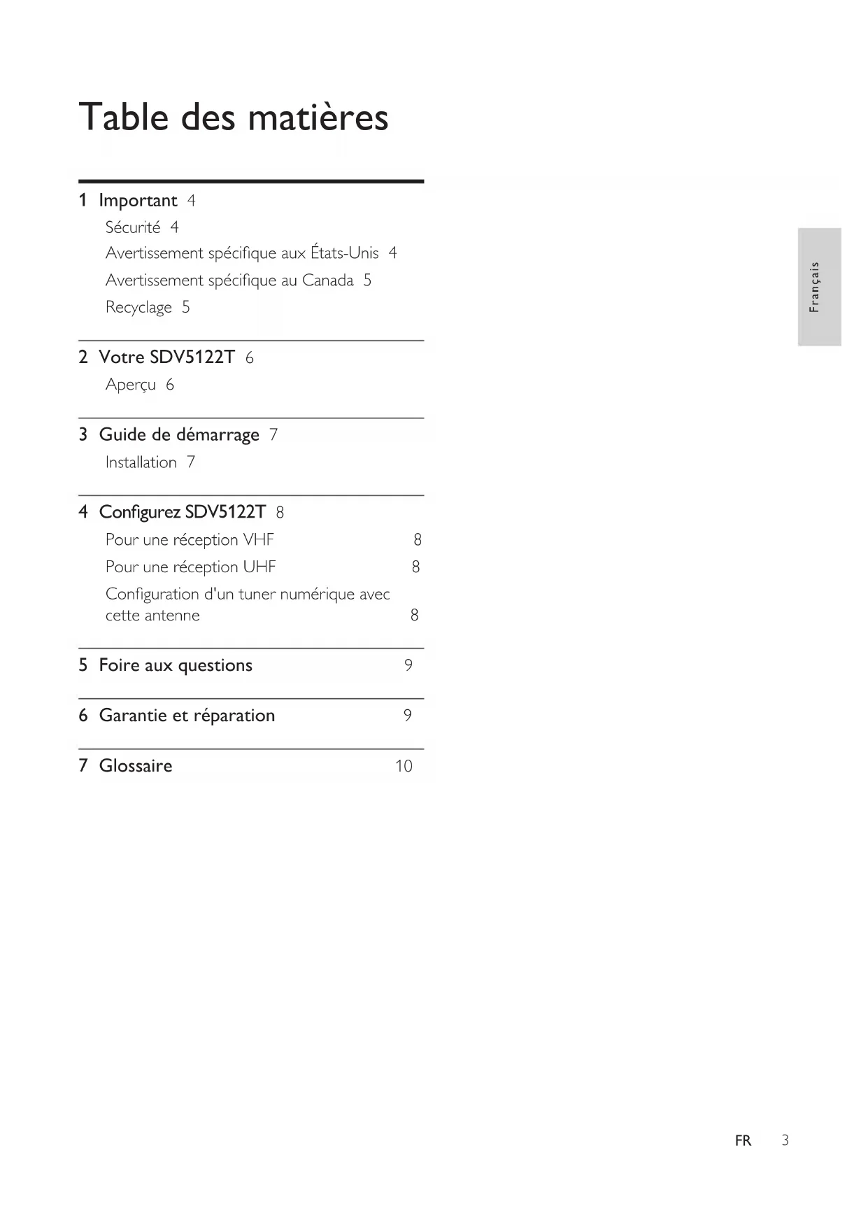 Table des matières 1 Important 4 Sécurité 4 Avertissement spécique aux États-Unis 4 Avertissement spécique au Canada 5 Recyclage 5 2 Votre SDV5122T 6 Aperçu 6 3 Guide de démarrage 7 Installation 7 4 Congurez SDV5122T 8 Pour une réception VHF 8 Pour une réception UHF 8 Conguration d'un tuner numérique avec cette antenne 8 5 Foire aux questions 9 6 Garantie et réparation 9 7 Glossaire 104 AvertissementAn de limiter les risques d'incendie ou de décharge •électrique, cet appareil doit être conservé à l'abri de la pluie ou de l'humidité. Aucun objet rempli de liquide, tel qu'un vase par exemple, ne doit être placé sur l'appareil. AttentionPour éviter tout risque d'électrocution, insérez •complètement la che. (Pour les pays utilisant des ches polarisées : pour éviter tout risque d'électrocution, alignez la broche large sur l'orice large correspondant.) Avertissement spécique aux États-Unis À l'issue des tests dont il a fait l'objet, cet équipement a été déclaré conforme à la