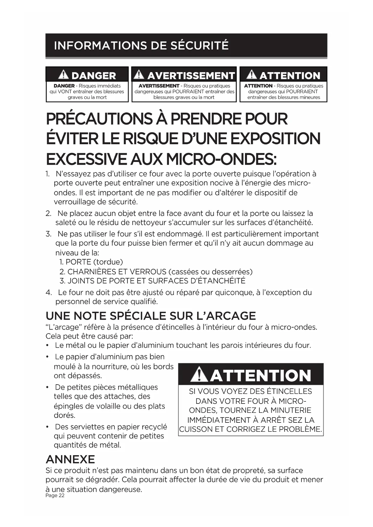 Précautions À Suivre Pour Éviter Une Exposition Possible À L'énergie Mico-Ondes Excessive .....22