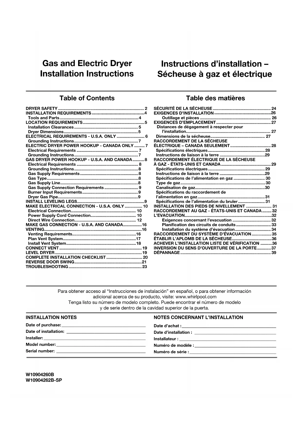 Rassembler les outils et pièces nécessaires avant d’entreprendre l’installation. Lire et observer les instructions fournies avec chacun des outils de la liste ci-dessous. Outils nécessaires à toutes les installations : Pieds de nivellement (4) Tournevis Phillips n° 2 Cisaille de ferblantier (pour l’installation d’un nouveau conduit) Outils nécessaires pour les installations à gaz : Clé à tuyau de 8" (203 mm) ou 10" (254 mm) Clé à mollette de 8" (203 mm) ou 10" (254 mm) (pour le raccordement au gaz) En cas d’utilisation d’un câble d’alimentation électrique : Utiliser un ensemble de câble d’alimentation électrique homologué UL marqué pour utilisation avec les sécheuses à vêtements. L’ensemble doit contenir : ■ Un câble d’alimentation électrique homologué UL de 30 ampères, 120/240 volts minimum, avec une température nominale d’au moins 140° F (60° C). Le cordon doit être de type SRD ou SRDT et mesurer au moins 4 pi (1,22 m) de long. Les ls raccordés à la sécheuse doivent se terminer par des cosses rondes ou à fourche à pointes relevées. ■ Un serre-câble (homologation UL).27 Pièces nécessaires : (Non fourni avec la sécheuse) Consulter les codes locaux. Vérier l’alimentation électrique et le circuit d’évacuation existants. Voir “Installations électriques” et “Exigences concernant l’évacuation” avant d’acheter les pièces. Les installations pour maison mobile nécessitent un système d’évacuation en métal disponible chez le marchand chez qui vous avez acheté votre sécheuse. Pour plus d’informations, voir la section “Assistance ou service” dans le “Guide d’utilisation et d’entretien”.