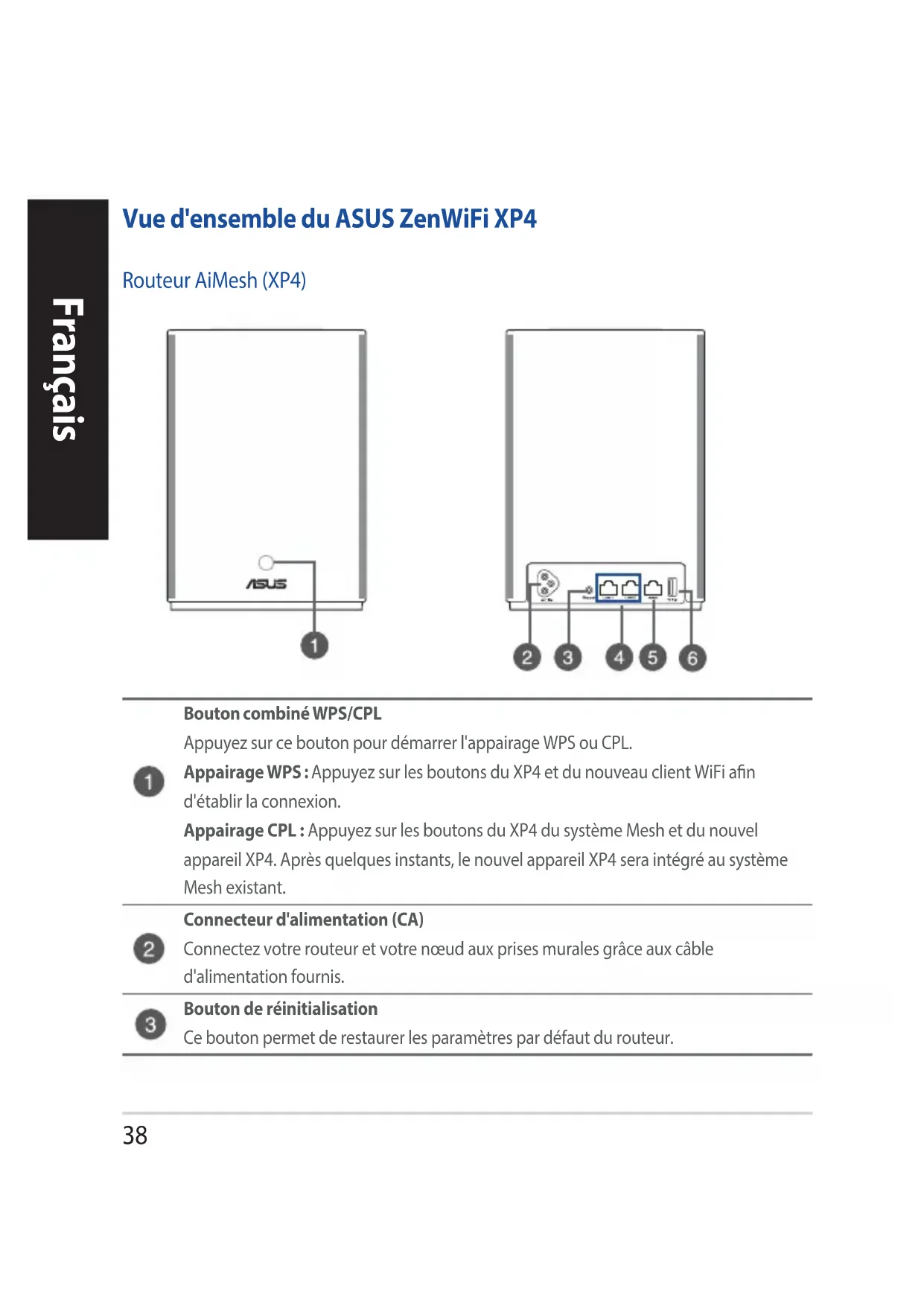 - Andmesidekiiruse tõstmiseks kasutage 3-kontaktilisi pistikupesi 2-kontaktiliste pistikupesade asemel. MÄRKUS: Kui soovite AiMesh ruuteri määrata pääsupunktiks, siis minge GUI-kasutajaliidese saidile (http://router.asus.com) ja sealt lehele Administration (Haldamine) > Operation Mode (Töörežiim).38 Français Vue d'ensemble du ASUS ZenWiFi XP4 Routeur AiMesh (XP4) Bouton combiné WPS/CPL Appuyez sur ce bouton pour démarrer l'appairage WPS ou CPL. Appairage WPS : Appuyez sur les boutons du XP4 et du nouveau client WiFi an d'établir la connexion. Appairage CPL : Appuyez sur les boutons du XP4 du système Mesh et du nouvel appareil XP4. Après quelques instants, le nouvel appareil XP4 sera intégré au système Mesh existant. Connecteur d'alimentation (CA) Connectez votre routeur et votre nœud aux prises murales grâce aux câble d'alimentation fournis. Bouton de réinitialisation Ce bouton permet de restaurer les paramètres par défaut du routeur.39 Français Prise d'alimentation (CA) 100-240Vca, 50/60Hz, 1A Température de fonctionnement 0-40°C Stockage 0-70°C Humidité de fonctionnement 50-90 % Stockage 20-90 % Caractéristiques Ports réseau local (LAN) Connectez des câbles réseau sur ces ports pour établir une connexion à un réseau local (LAN). Port réseau étendu (WAN) Connectez un câble réseau sur ce port pour établir une connexion à un réseau étendu (WAN). Si vous utilisez le XP4 en tant que nœud AiMesh, vous pouvez relier un câble réseau entre le port LAN (réseau local) d'un routeur AiMesh et son port WAN (réseau étendu) pour une liaison montante (Uplink) sur Ethernet backhaul. Port USB 3.1 Gen1 Insérez un dispositif USB 3.1 Gen1 / 2.0 tel qu'un périphérique de stockage ou un modem 3G/4G USB dans ce port. Si vous utilisez le XP4 en tant que nœud AiMesh, le port USB prend en charge les fonctions AiDisk et sauvegarde de Mac OS.40 Français Indications de la LED du ZenWiFi Hybrid XP4 Bleu xe Votre routeur ou nœud AiMesh est prêt pour la conguration. Blanc xe Votre routeur ou nœud AiMesh est connecté et fonctionne correctement. Orange xe Le signal entre votre routeur AiMesh et votre nœud est faible. Rouge xe Votre routeur AiMesh n'est pas connecté à internet. Votre nœud AiMesh n'est pas connecté au routeur. Bleu clignotant Votre routeur AiMesh est en train d'appliquer les nouveaux paramètres. Orange clignotant Votre routeur ou nœud AiMesh est en train de se réinitialiser. Violet xe Votre routeur ou nœud AiMesh est en mode de secours.