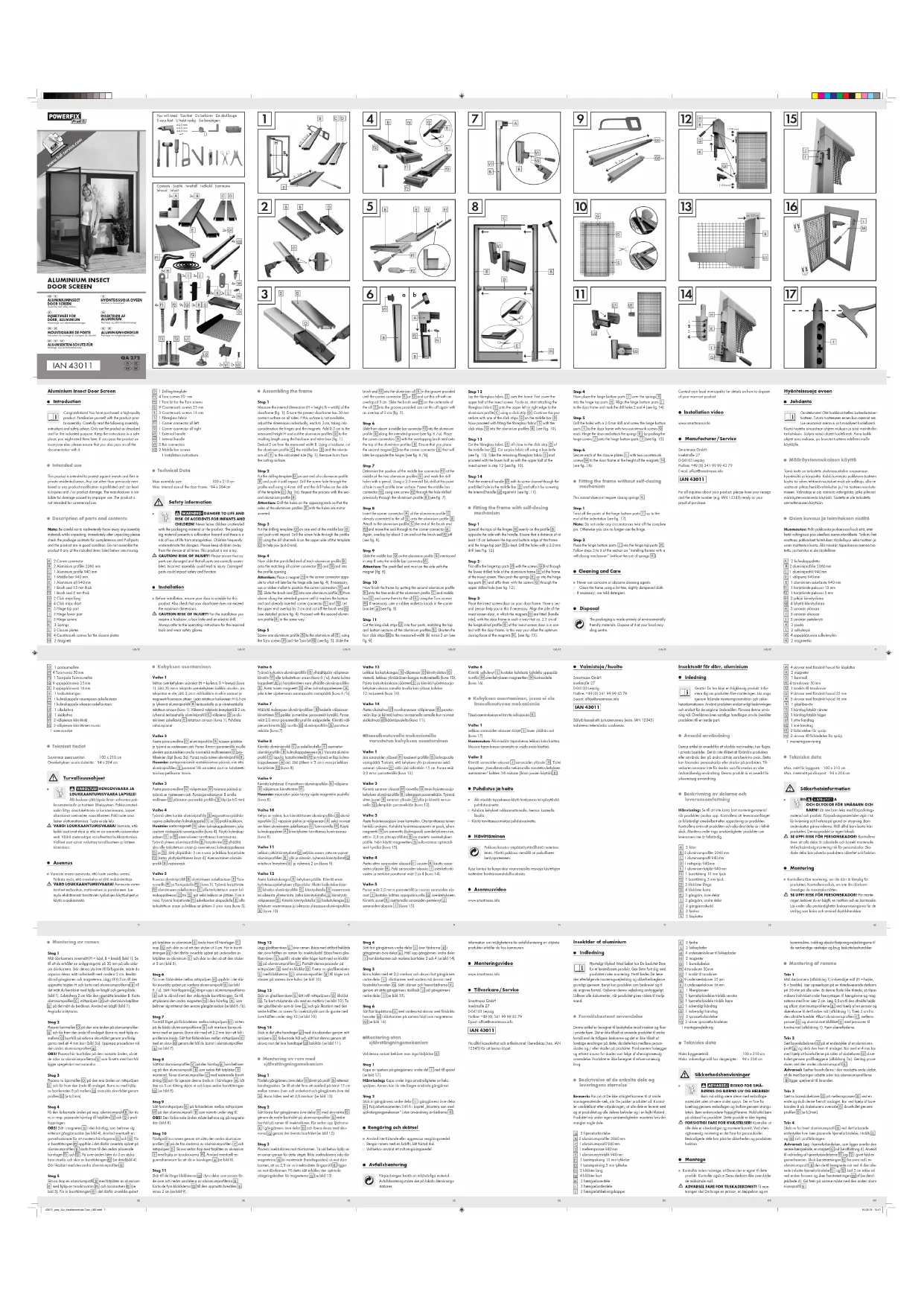 LES ENFANTS ET LES ENFANTS EN BAS ÂGE! Ne laissez jamais les enfants manipuler sans sur- veillance le matériel d‘emballage et le produit. Il existe un risque d’étouffement par le matériel d’emballage et un danger de mort par strangulation. Les enfants sous-esti- ment souvent le danger. Toujours tenir l‘appareil à l‘écart des enfants. Ce produit n’est pas un jouet. ATTENTION ! RISQUE DE BLESSURE ! Vérifier que toutes les pièces sont en parfait état et correctement mon- tées. Risque de blessures en cas de montage incorrect. Les pièces endommagées peuvent affecter la sécurité et le fonctionnement. Montage Assurez-vous avant le montage que votre porte est adap- tée à ce produit. Assurez-vous également que le cadre de la porte ne dépasse pas les dimensions maximales. Moustiquaire de porte Introduction Félicitations ! Vous avez opté pour un produit de grande qualité. Familiarisez-vous avec le produit avant de procéder au montage. Lisez pour cela attentivement la notice de montage suivante et les indications de sécurité. Utilisez ce produit uniquement conformément aux instructions et dans les domaines d’application spécifiés. Veuillez conserver soigneusement cette notice. Remettez les documents aux utilisateurs lorsque vous prêtez ce produit. Utilisation conforme Ce produit est prévu comme particulièrement contre les insectes tels que les mouches dans l’habitat privé. Toute autre utilisation que celle décrite auparavant ou toute modification du produit est interdite et peut se traduire par des blessures et / ou endommager le produit. Le fabricant décline toute responsa- bilité pour les dégâts résultant d‘une utilisation non conforme. Le produit n’est pas destiné à une utilisation professionnelle. Fourniture/description des pièces Remarque : Lorsque vous sortez le produit de l’emballage, veillez à ne pas jeter par inadvertance du matériel de montage. Contrôlez immédiatement après le déballage le contenu de livraison en ce qui concerne l‘intégralité du contenu de livrai- son, ainsi que l‘état irréprochable du produit et de toutes ses pièces. Il ne faut en aucun cas assembler le produit si la four- niture n‘est pas au complet.
