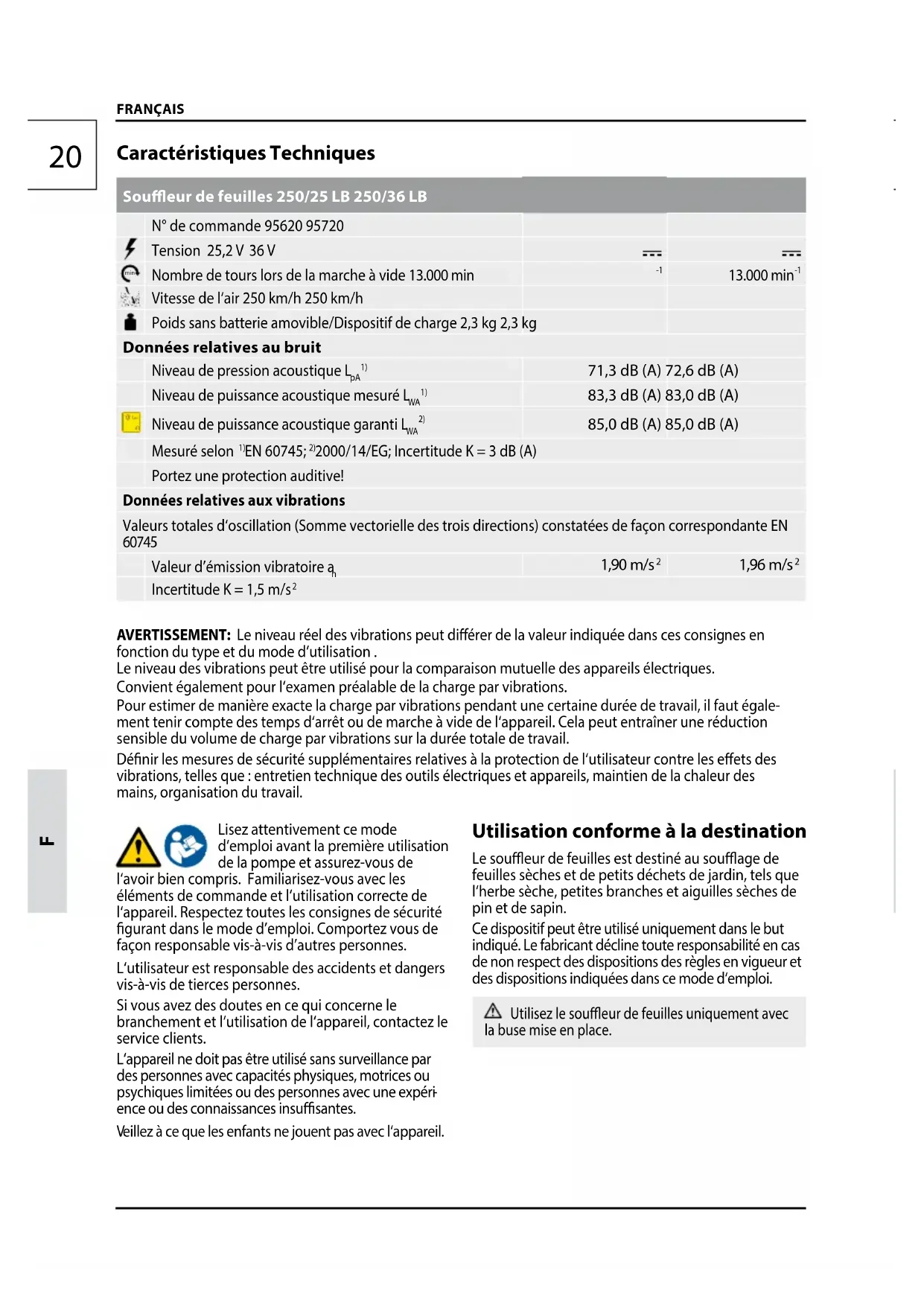 eillez à ce que les enfants ne jouent pas avec l‘appareil. Utilisation conforme à la destination Le soueur de feuilles est destiné au souage de feuilles sèches et de petits déchets de jardin, tels que l‘herbe sèche, petites branches et aiguilles sèches de pin et de sapin. Ce dispositif peut être utilisé uniquement dans le but indiqué. Le fabricant décline toute responsabilité en cas de non respect des dispositions des règles en vigueur et des dispositions indiquées dans ce mode d‘emploi. Utilisez le soueur de feuilles uniquement avec la buse mise en place. Caractéristiques Techniques Soueur de feuilles 250/25 LB 250/36 LB N° de commande 95620 95720 Tension 25,2 V 36 V min Nombre de tours lors de la marche à vide 13.000 min