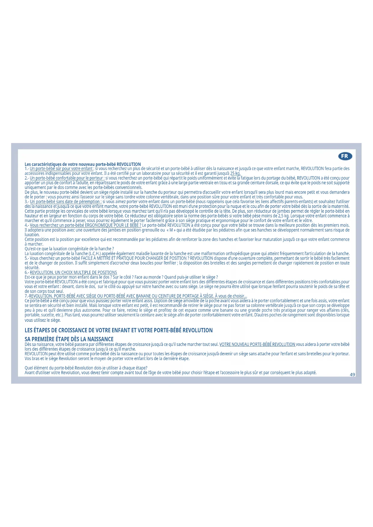 FRLes caractéristiques de votre nouveau porte-bébé REVOLUTION 1.- Un porte-bébé sûr pour votre enfant : si vous recherchez un plus de sécurité et un porte-bébé à utiliser dès la naissance et jusqu’à ce que votre enfant marche, REVOLUTION fera partie des accessoires indispensables pour votre enfant. Il a été certifié par un laboratoire pour sa sécurité et il est garanti jusqu’à 25 kg. 2.- Un porte-bébé confortable pour le porteur : si vous recherchez un porte-bébé qui répartit le poids uniformément et évite la fatigue lors du portage du bébé, REVOLUTION a été conçu pour apporter un plus de confort à l’adulte, en répartissant le poids de votre enfant grâce à une large partie ventrale en tissu et sa grande ceinture dorsale, ce qui évite que le poids ne soit supporté uniquement par le dos comme avec les porte-bébés conventionnels. De plus, le nouveau porte-bébé devient un siège rigide installé sur la hanche du porteur qui permettra d’accueillir votre enfant lorsqu’il sera plus lourd mais encore petit et vous demandera de le porter : vous pourrez ainsi l’asseoir sur le siège sans tordre votre colonne vertébrale, dans une position sûre pour votre enfant et très confortable pour vous. 3.- Un porte-bébé sans date de péremption : si vous aimez porter votre enfant dans un porte-bébé (nous rappelons que cela favorise les liens affectifs parents-enfants) et souhaitez l’utiliser dès la naissance et jusqu’à ce que votre enfant marche, votre porte-bébé REVOLUTION est muni d’une protection pour la nuque et le cou afin de porter votre bébé dès la sortie de la maternité. Cette partie protège les cervicales de votre bébé lorsque vous marchez tant qu’il n’a pas développé le contrôle de la tête. De plus, son réducteur de jambes permet de régler le porte-bébé en hauteur et en largeur en fonction du corps de votre bébé. Ce réducteur est obligatoire selon la norme des porte-bébés si votre bébé pèse moins de 2,5 kg. Lorsque votre enfant commence à marcher et qu’il commence à peser, vous pourrez également le porter facilement grâce à son siège pratique et ergonomique pour le confort de votre enfant et le vôtre. 4.- Vous recherchez un porte-bébé ERGONOMIQUE POUR LE BÉBÉ ? Le porte-bébé REVOLUTION a été conçu pour que votre bébé se trouve dans la meilleure position dès les premiers mois. Il adoptera une position avec une ouverture des jambes en position grenouille ou « M » qui a été étudiée par les pédiatres afin que ses hanches se développent normalement sans risque de luxation. Cette position est la position par excellence qui est recommandée par les pédiatres afin de renforcer la zone des hanches et favoriser leur maturation jusqu’à ce que votre enfant commence à marcher. Qu’est-ce que la luxation congénitale de la hanche ? La luxation congénitale de la hanche (L.C.H.) appelée également maladie luxante de la hanche est une malformation orthopédique grave qui atteint fréquemment l’articulation de la hanche. 5.- Vous cherchez un porte-bébé FACILE À METTRE ET PRATIQUE POUR CHANGER DE POSITION ? REVOLUTION dispose d’une ouverture complète, permettant de sortir le bébé très facilement et de le changer de position. Il suffit simplement d’accrocher deux boucles pour l’enfiler ; la disposition des bretelles et des sangles permettent de changer rapidement de position en toute sécurité. 6.- REVOLUTION. UN CHOIX MULTIPLE DE POSITIONS Est-ce que je peux porter mon enfant dans le dos ? Sur le côté ? Face au monde ? Quand puis-je utiliser le siège ? Votre porte-bébé REVOLUTION a été conçu et fabriqué pour que vous puissiez porter votre enfant lors des différentes étapes de croissance et dans différentes positions très confortables pour vous et votre enfant : devant, dans le dos, sur le côté ou appuyé sur votre hanche avec ou sans siège. Le siège ne pourra être utilisé que lorsque l’enfant pourra soutenir le poids de sa tête et de son corps tout seul. 7.-REVOLUTION. PORTE-BÉBÉ AVEC SIÈGE OU PORTE-BÉBÉ AVEC BANANE OU CEINTURE DE PORTAGE À SIÈGE. À vous de choisir... Ce porte-bébé a été conçu pour que vous puissiez porter votre enfant assis. L’option de siège amovible de la poche avant vous aidera à le porter confortablement et une fois assis, votre enfant se sentira en sécurité et bien installé. Mais lorsque votre enfant est petit, il est recommandé de retirer le siège pour ne pas forcer sa colonne vertébrale jusqu’à ce que son corps se développe peu à peu et qu’il devienne plus autonome. Pour ce faire, retirez le siège et profitez de cet espace comme une banane ou une grande poche très pratique pour ranger vos affaires (clés, portable, sucette, etc.). Plus tard, vous pourrez utiliser seulement la ceinture avec le siège afin de porter confortablement votre enfant. D’autres poches de rangement sont disponibles lorsque vous utilisez le siège. LES ÉTAPES DE CROISSANCE DE VOTRE ENFANT ET VOTRE PORTE-BÉBÉ REVOLUTION SA PREMIÈRE ÉTAPE DÈS LA NAISSANCE Dès sa naissance, votre bébé passera par différentes étapes de croissance jusqu’à ce qu’il sache marcher tout seul. VOTRE NOUVEAU PORTE-BÉBÉ REVOLUTION vous aidera à porter votre bébé lors des différentes étapes de croissance jusqu’à ce qu’il marche. REVOLUTION peut être utilisé comme porte-bébé dès la naissance ou pour toutes les étapes de croissance jusqu’à devenir un siège sans attache pour l’enfant et sans bretelles pour le porteur. Vos bras et le siège Revolution seront le moyen de porter votre enfant lors de la dernière étape. Quel élément du porte-bébé Revolution dois-je utiliser à chaque étape? Avant d’utiliser votre Revolution, vous devez tenir compte avant tout de l’âge de votre bébé pour choisir l’étape et l’accessoire le plus sûr et par conséquent le plus adapté.