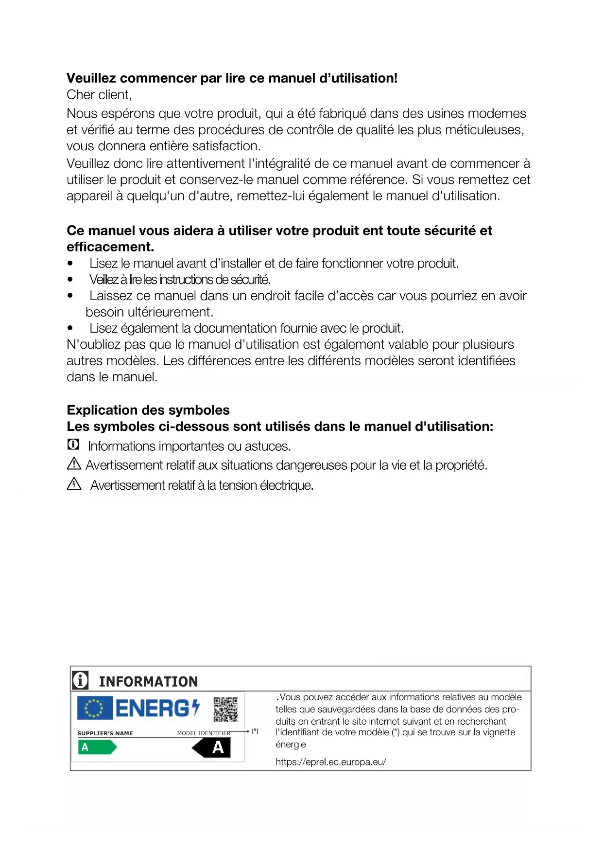 RDNE350K30WNVeuillez commencer par lire ce manuel d’utilisation!Cher client,Nous espérons que votre produit, qui a été fabriqué dans des usines modernes et vérifié au terme des procédures de contrôle de qualité les plus méticuleuses, vous donnera entière satisfaction.Veuillez donc lire attentivement l'intégralité de ce manuel avant de commencer à utiliser le produit et conservez-le manuel comme référence. Si vous remettez cet appareil à quelqu'un d'autre, remettez-lui également le manuel d'utilisation.Ce manuel vous aidera à utiliser votre produit ent toute sécurité et efficacement.t Lisez le manuel avant d’installer et de faire fonctionner votre produit.t Veillez à lire les instructions de sécurité.t Laissez ce manuel dans un endroit facile d’accès car vous pourriez en avoir besoin ultérieurement. t Lisez également la documentation fournie avec le produit.N'oubliez pas que le manuel d'utilisation est également valable pour plusieurs autres modèles. Les différences entre les différents modèles seront identifiées dans le manuel. Explication des symbolesLes symboles ci-dessous sont utilisés dans le manuel d'utilisation: C Informations importantes ou astuces. A Avertissement relatif aux situations dangereuses pour la vie et la propriété. B Avertissement relatif à la tension électrique. .Vous pouvez accéder aux informations relatives au modèle telles que sauvegardées dans la base de données des pro-duits en entrant le site internet suivant et en recherchant l'identifiant de votre modèle (*) qui se trouve sur la vignette énergiehttps://eprel.ec.europa.eu/