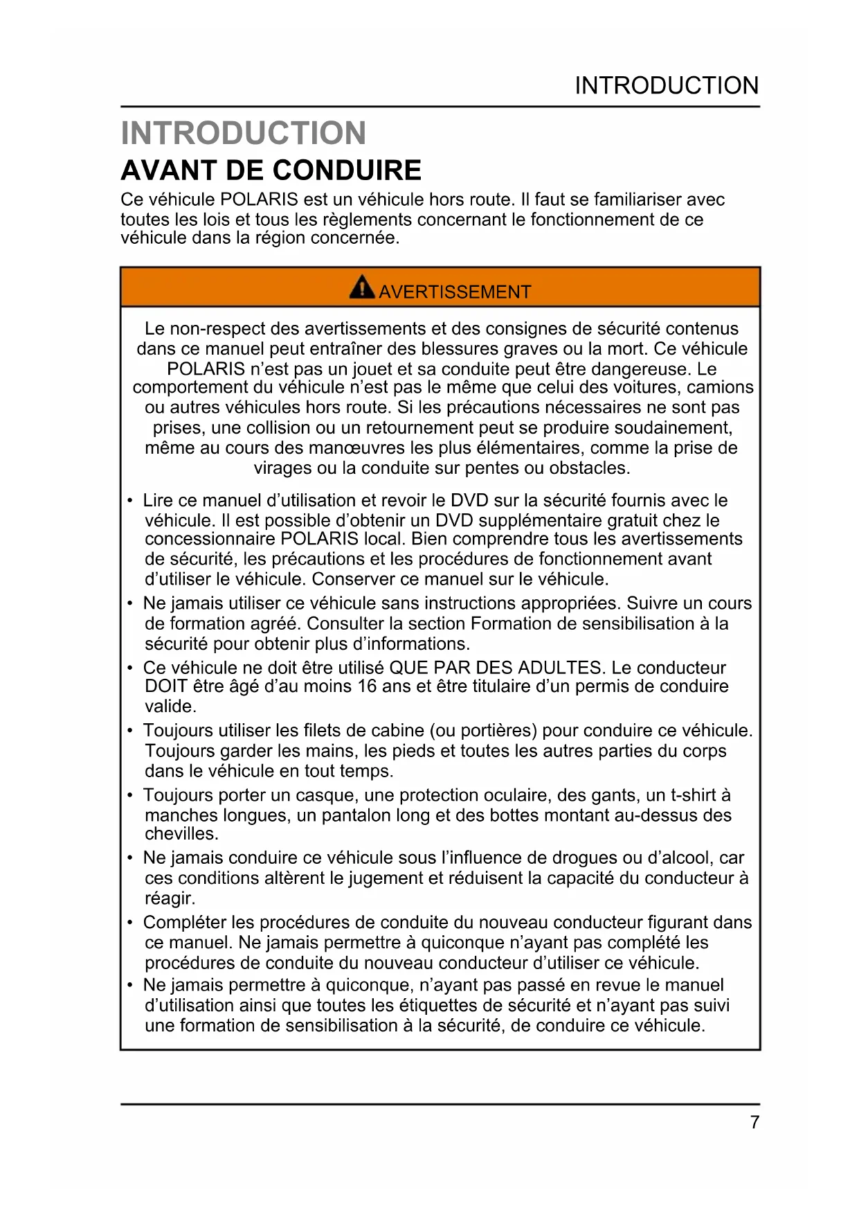 Ce vehicule POLARIS est un vehicule hors route. Il faut se familiariser avec toutes les lois et tous les reglements concernant le fonctionnement de ce vehicule dans la région concernée.