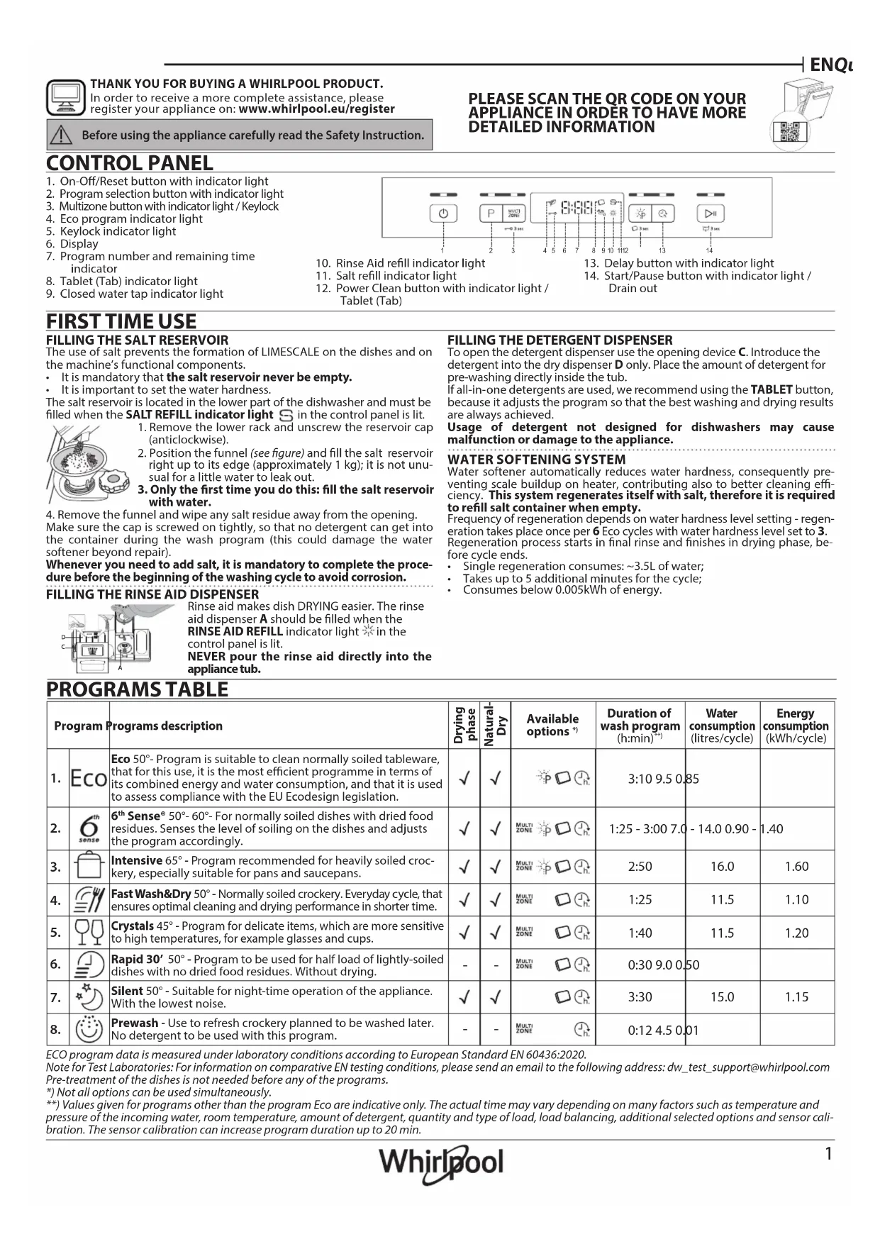 Les données du programme Éco sont mesurées sous des conditions en laboratoire conformément à la norme européenne EN 60436:2020. Note pour les laboratoires d’essai : pour toutes informations sur les conditions d’essai comparatif EN, s’adresser à: dw_test_support@whirlpool.com Aucun prétraitement de la vaisselle n’est nécessaire avant l’un quelconque des programmes.*) Les options ne peuvent pas toutes être utilisées en même temps. **) Les valeurs indiquées pour des programmes diérents du programme Éco sont fournis à titre indicatif uniquement. Le temps réel peut varier selon des facteurs comme la température et la pression de l’eau, la température de la pièce, la quantité de détergent, la quantité et le type de vaisselle, l’équilibre de la charge, les options supplémentaires sélectionnées, et la calibration du capteur. La calibration du capteur peut augmenter la durée du programme jusqu’à 20 minutes.