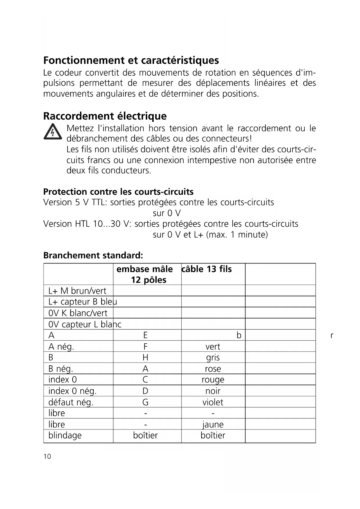Wellenklemmring stator coupling Open to one side hollow shaftFonctionnement et caractéristiques Le codeur convertit des mouvements de rotation en séquences d'im- pulsions permettant de mesurer des déplacements linéaires et des mouvements angulaires et de déterminer des positions. Raccordement électrique Mettez l'installation hors tension avant le raccordement ou le débranchement des câbles ou des connecteurs! Les fils non utilisés doivent être isolés afin d'éviter des courts-cir- cuits francs ou une connexion intempestive non autorisée entre deux fils conducteurs. Protection contre les courts-circuits Version 5 V TTL: sorties protégées contre les courts-circuits sur 0 V Version HTL 10...30 V: sorties protégées contre les courts-circuits sur 0 V et L+ (max. 1 minute) Branchement standard: