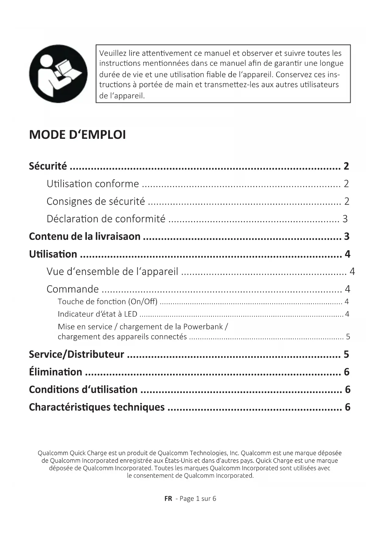 - Charactérisques techniques FR - Page 1 sur 6 Qualcomm Quick Charge est un produit de Qualcomm Technologies, Inc. Qualcomm est une marque déposée de Qualcomm Incorporated enregistrée aux États-Unis et dans d‘autres pays. Quick Charge est une marque déposée de Qualcomm Incorporated. Toutes les marques Qualcomm Incorporated sont utilisées avec le consentement de Qualcomm Incorporated.SÉCURITÉ Ulisaon conforme Ce Powerbank est exclusivement desné à alimenter en courant électrique des appareils ayant une tension de service de 5V courant connu (téléphones mobiles, lecteurs MP3, etc.), ainsi que d’appareils qui pren- nent en charge la norme Power Delivery (PD) ou la norme de technologie Qualcomm® Quick Charge™. Ce produit n‘est pas desné à un usage commercial ou pour des applicaons médicales et spéciales où une panne du produit pourrait causer des blessures, la mort ou des dommages matériels considérables. En cas d‘usage contraire à l‘ulisaon conforme, la garane devient caduque. Il est interdit d‘ouvrir ou de modier l‘appareil ou d‘uliser des appareils supplémentaires ou accessoires non approuvés par nous. N‘ulisez pas l‘appareil dans des condions environnementales extrêmes et respectez les consignes de sécurité. Le non- respect des informaons et consignes de sécurité gurant dans le présent mode d‘emploi sera considéré comme non-respect de l‘ulisaon conforme et entraîne l‘annulaon de notre responsabili- té ; il peut également en résulter des dommages corporels ou matériels. Le micrologiciel et/ou le matériel peut être modié à tout moment sans préavis. Pour cee raison, il est possible que certaines pares du présent mode d‘emploi, caractérisques techniques et illustraons gu- rant dans la présente documentaon dièrent légèrement du produit dont vous disposez. L‘ensemble des produits décrits dans le présent mode d‘emploi sert uniquement à des ns d‘illustraon et ne correspond pas nécessairement à une situaon spécique. Tout recours découlant du présent mode d‘emploi est exclu. Consignes de sécurité Risques pour les enfants et pour les personnes aux facultés physiques, sensorielles ou mentales diminuées : Les enfants sous-esment fréquemment les risques ou ne les idenent pas du tout. Cet appareil n‘est pas desné à être ulisé par des personnes (enfants y compris) aux facultés sensorielles, physiques ou mentales diminuées ou manquant de l‘expérience et/ou des connaissances nécessaires, à moins d‘être surveillées par une personne responsable de leur sécurité ou d‘avoir bénécié d‘instrucons de la part de cee per- sonne sur la manière d‘uliser l‘appareil et d‘avoir compris les risques qui en résultent. Les enfants non surveillés ne doivent pas avoir accès à l‘appareil. Assurez-vous que les enfants ne jouent pas avec l‘appareil. Risque d’étouement ! Les enfants peuvent mere le lm d‘emballage ou les petes pièces dans leur bouche, ce qui peut les étouer. Danger de court-circuit ! Pour éviter toute blessure, n‘ulisez pas cet appareil avec des mains mouillées. N‘enfoncez pas d‘objets non prévus à cet eet dans les orices de l‘appareil. Cela pourrait occasionner un court-circuit électrique et un incendie qui en résulterait. N‘ulisez jamais l‘appareil s‘il présente des dommages visibles sur l‘appareil lui-même ou sur le câble USB, car cela pourrait entraîner des blessures ou des dommages. L‘appareil ne doit pas être exposé à des projecons ou à des goues d‘eau. Les récipients remplis de liquide (vases, verres ou similaires) ne doivent pas être placés sur l‘appareil ou à proximité immédiate. Il y a un risque que le récipient se renverse et que le liquide aecte la sécurité électrique. FR - Page 2 sur 6Risque de trébuchement ! Lors du posionnement l‘appareil, veillez à ce que personne ne puisse marcher sur le câble ou trébucher sur ce dernier. Ne posez pas d‘objets sur le câble. Endommagement ! N‘ulisez pas l‘appareil dans des régions extrêmement froides, chaude, humides ou poussiéreu- ses. Veillez également à ne pas l‘exposer directement à la lumière du soleil. Protégez le produit contre les feux nus. Il existe un risque d‘explosion ! Protégez l‘appareil contre les chocs et les chutes, peu importe son état de fonconnement. Cet appareil est sensible aux décharges électrostaques. Protégez par conséquent l‘appareil cont- re toute charge électrostaque éventuelle. Pour éviter les dysfonconnements, ne reliez pas les ports de sore USB de l‘appareil aux ports USB d‘un ordinateur ou d‘un autre appareil. Ils sont uniquement desnés au chargement d‘ap- pareils spéciques. Pour éviter toute surchaue, ne bloquez pas et ne couvrez pas les ouvertures du produit. Ne couvrez pas complètement le produit pendant son fonconnement an de garanr la dissipaon de la chaleur. N‘ouvrez pas le boîer de l‘appareil et ne désassemblez pas l‘appareil. N‘essayez pas de le réparer par vos propres moyens. La garane deviendrait caduque dans ces cas. ATTENTION ! Surface brûlante ! En cas d’ulisaon, un mainen prolongé pendant une longue période peut causer des lésions cutanées en raison de la chaleur. Lors de son ulisaon, évitez de le maintenir pendant une longue du- rée sur les zones parculiè- rement chaudes. Ne portez pas l‘appareil di- rectement sur votre corps pen- dant l‘ulisaon. Après refroidissement, l‘appareil peut être manipulé sans problème. Déclaraon de conformité Le marquage CE indique que ce produit sasfait aux exigences de toutes les direcves UE appli- cables à ce produit. p. 6
