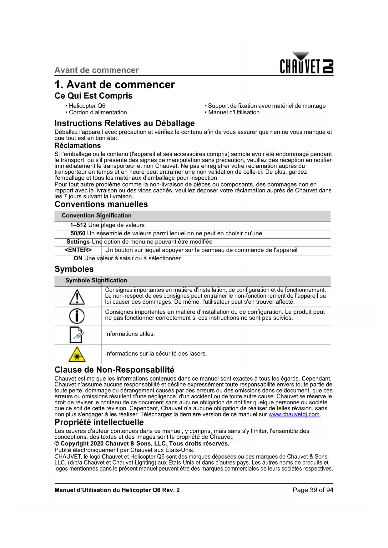 Propriété intellectuelle Les œuvres d'auteur contenues dans ce manuel, y compris, mais sans s'y limiter, l'ensemble des conceptions, des textes et des images sont la propriété de Chauvet. © Copyright 2020 Chauvet & Sons, LLC. Tous droits réservés. Publié électroniquement par Chauvet aux États-Unis. CHAUVET, le logo Chauvet et Helicopter Q6 sont des marques déposées ou des marques de Chauvet & Sons LLC. (d/b/a Chauvet et Chauvet Lighting) aux États-Unis et dans d'autres pays. Les autres noms de produits et logos mentionnés dans le présent manuel peuvent être des marques commerciales de leurs sociétés respectives.