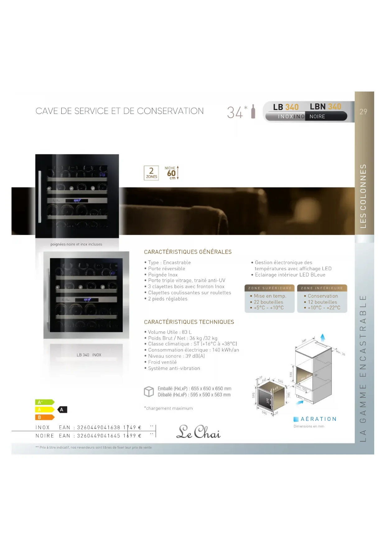 ** Prix à titre indicatif, nos revendeurs sont libres de fixer leur prix de vente LB 340 LBN 340 CARACTÉRISTIQUES TECHNIQUES • Gestion électronique des températures avec affichage LED• Eclairage intérieur LED BLeueCARACTÉRISTIQUES GÉNÉRALES• Volume Utile : 83 L• Poids Brut / Net : 36 kg /32 kg• Classe climatique : ST (+16°C à +38°C)• Consommation électrique : 140 kWh/an• Niveau sonore : 39 dB(A)• Froid ventilé• Système anti-vibration*chargement maximum • Type : Encastrable• Porte réversible• Poignée Inox• Porte triple vitrage, traité anti-UV• 3 clayettes bois avec fronton Inox • Clayettes coulissantes sur roulettes• 2 pieds réglables• Mise en temp.• 22 bouteilles• +5°C - +10°C• Conservation• 12 bouteilles• +10°C - +22°C