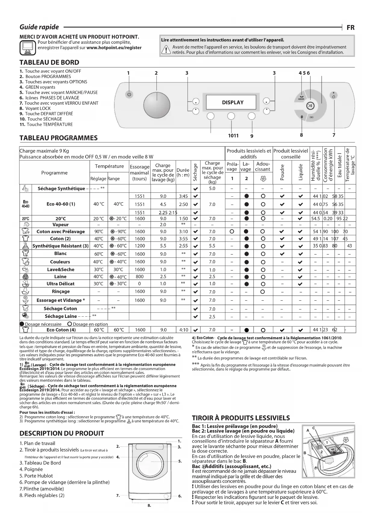 Guide rapide MERCI D’AVOIR ACHETÉ UN PRODUIT HOTPOINT. Pour bénécier d’une assistance plus complète, enregistrer l’appareil sur www.hotpoint.eu/register Lire attentivement les instructions avant d’utiliser l’appareil