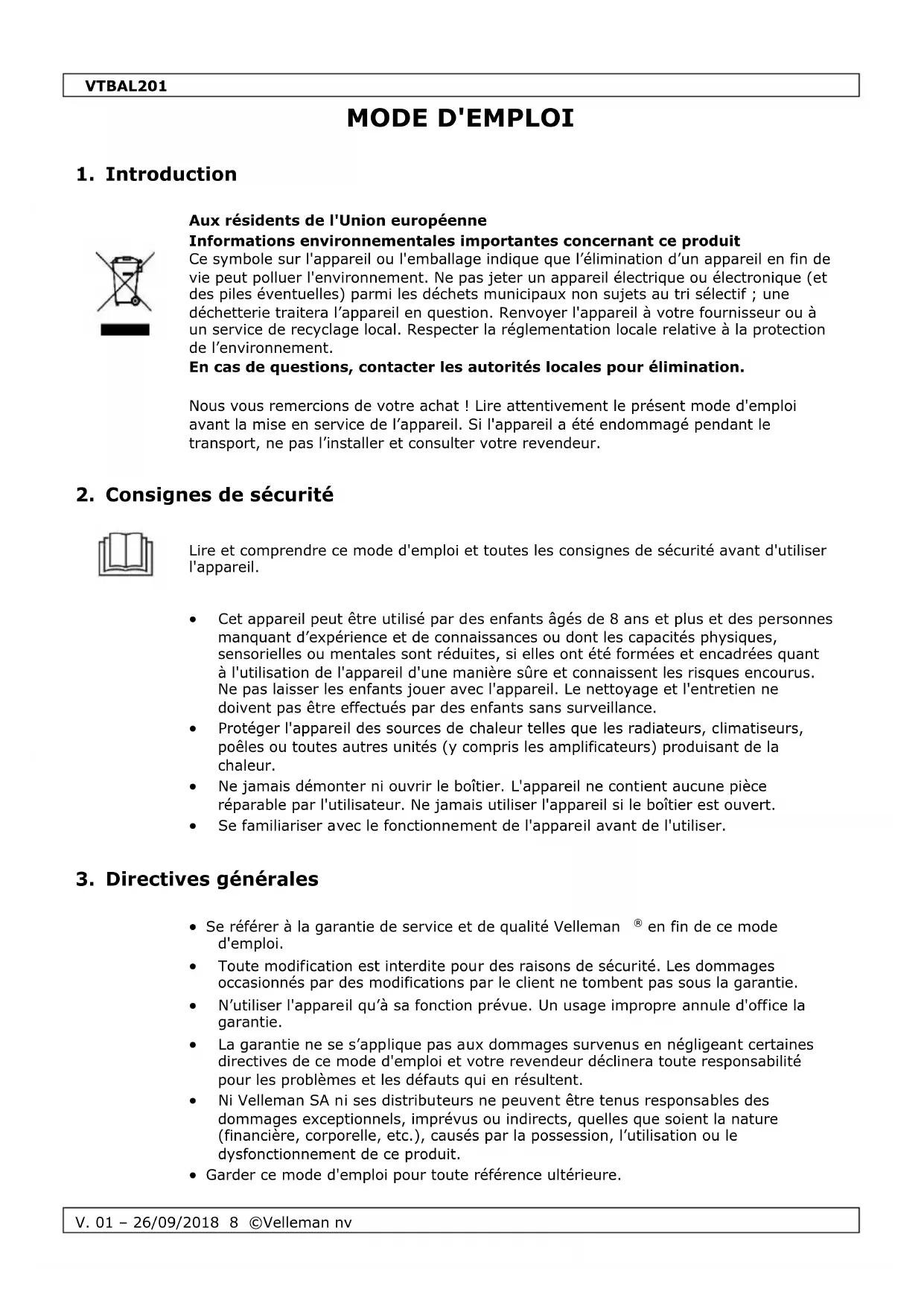 - Se référer à la garantie de service et de qualité Velleman en fin de ce mode d'emploi.