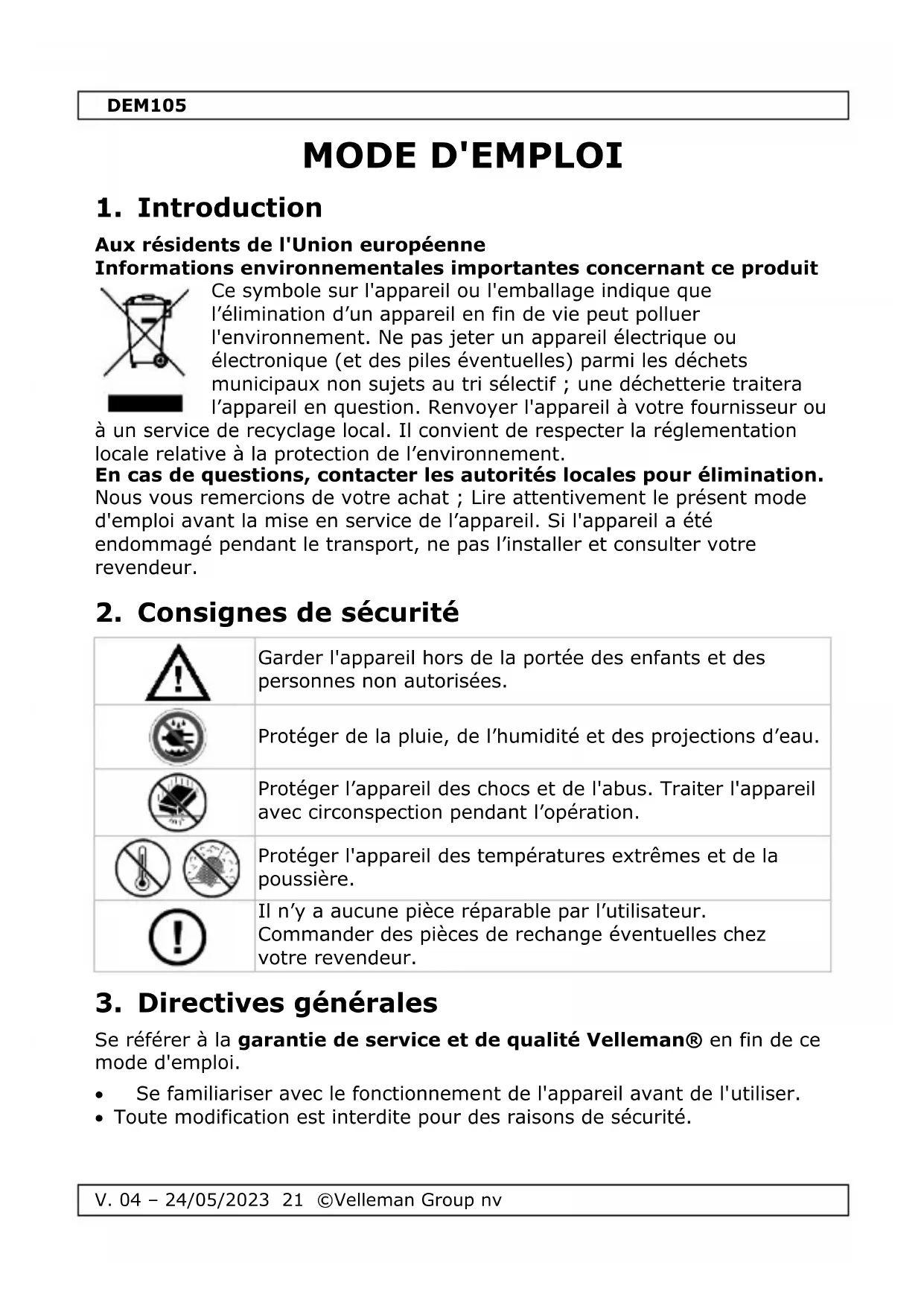 MODE D'EMPLOI DEM105 VELLEMAN