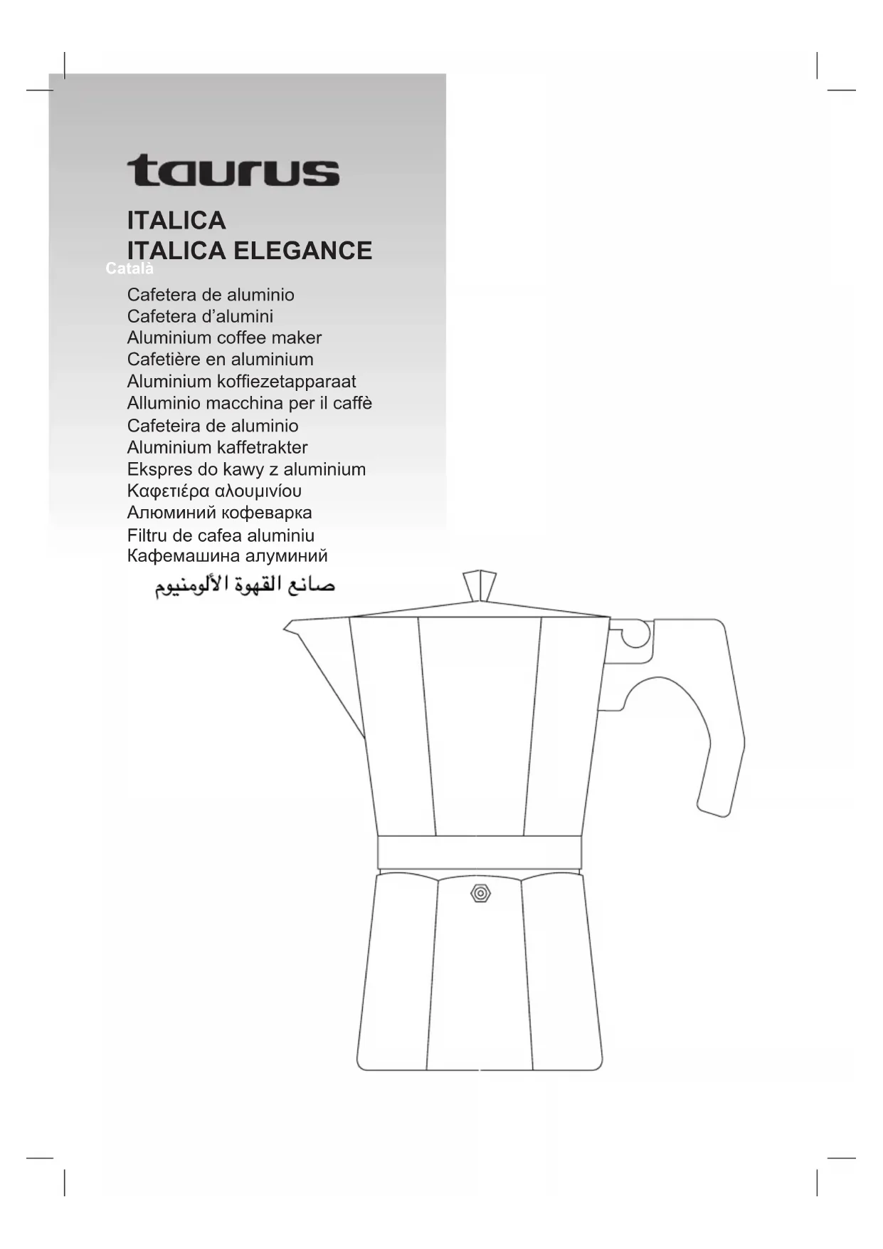 - If there occurs any anomaly, do not attempt to repair it. Contact an authorised service centre.Français Cafetière en aluminium Italica Italica elegance Cher Client, Nous vous remercions d’avoir choisi d’acheter un appareil ménager de marque TAURUS. Sa technologie, son design et sa fonctionnalité, s’ajoutant au fait qu’elle répond amplement aux normes de qualité les plus strictes, vous permet- tront d’en tirer une longue et durable satisfaction. DESCRIPTION A Corps inférieur. B Entonnoir Filtre. C Corps supérieur. D Soupape de sécurité.