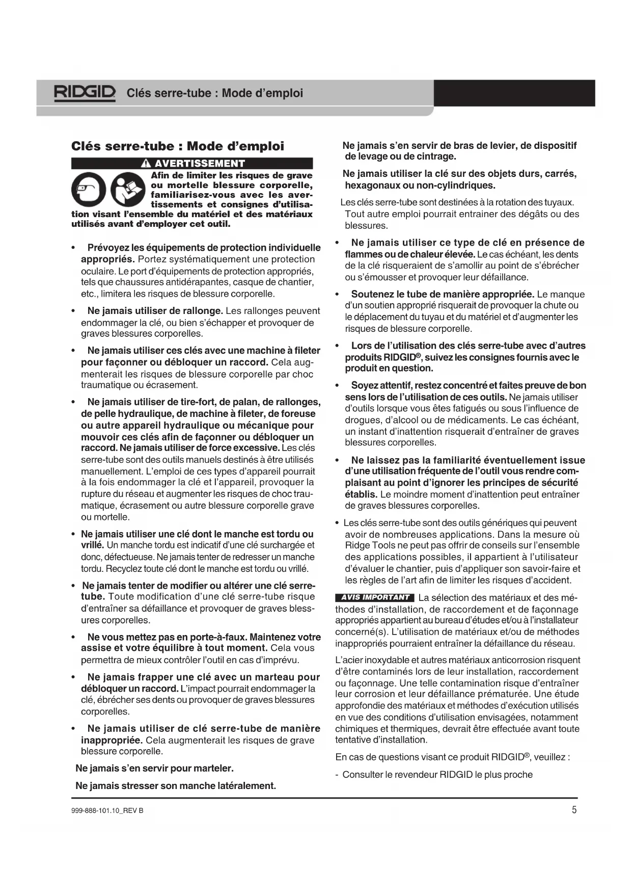 - Les clés serre-tube sont des outils génériques qui peuvent avoir de nombreuses applications. Dans la mesure où Ridge Tools ne peut pas offrir de conseils sur l’ensemble des applications possibles, il appartient à l’utilisateur d’évaluer le chantier, puis d’appliquer son savoir-faire et les règles de l’art afin de limiter les risques d’accident. AVIS IMPORTANT La sélection des matériaux et des mé- thodes d’installation, de raccordement et de façonnage appropriés appartient au bureau d’études et/ou à l’installateur concerné(s). L’utilisation de matériaux et/ou de méthodes inappropriés pourraient entraîner la défaillance du réseau. L’acier inoxydable et autres matériaux anticorrosion risquent d’être contaminés lors de leur installation, raccordement ou façonnage. Une telle contamination risque d’entraîner leur corrosion et leur défaillance prématurée. Une étude approfondie des matériaux et méthodes d’exécution utilisés en vue des conditions d’utilisation envisagées, notamment chimiques et thermiques, devrait être effectuée avant toute tentative d’installation. En cas de questions visant ce produit RIDGID