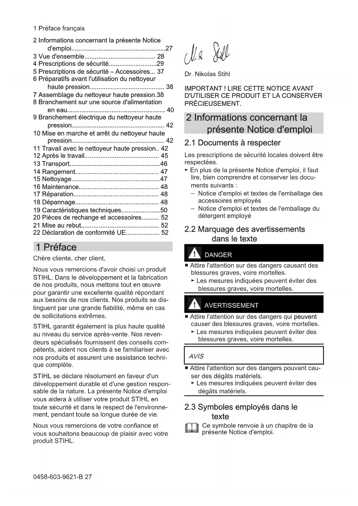 - 22 Déclaration de conformité UE 1 Préface Chère cliente, cher client, Nous vous remercions d'avoir choisi un produit STIHL. Dans le développement et la fabrication de nos produits, nous mettons tout en œuvre pour garantir une excellente qualité répondant aux besoins de nos clients. Nos produits se dis‐ tinguent par une grande fiabilité, même en cas de sollicitations extrêmes. STIHL garantit également la plus haute qualité au niveau du service après-vente. Nos reven‐ deurs spécialisés fournissent des conseils com‐ pétents, aident nos clients à se familiariser avec nos produits et assurent une assistance techni‐ que complète. STIHL se déclare résolument en faveur d'un développement durable et d'une gestion respon‐ sable de la nature. La présente Notice d'emploi vous aidera à utiliser votre produit STIHL en toute sécurité et dans le respect de l'environne‐ ment, pendant toute sa longue durée de vie. Nous vous remercions de votre confiance et vous souhaitons beaucoup de plaisir avec votre produit STIHL. Dr. Nikolas Stihl p. 52