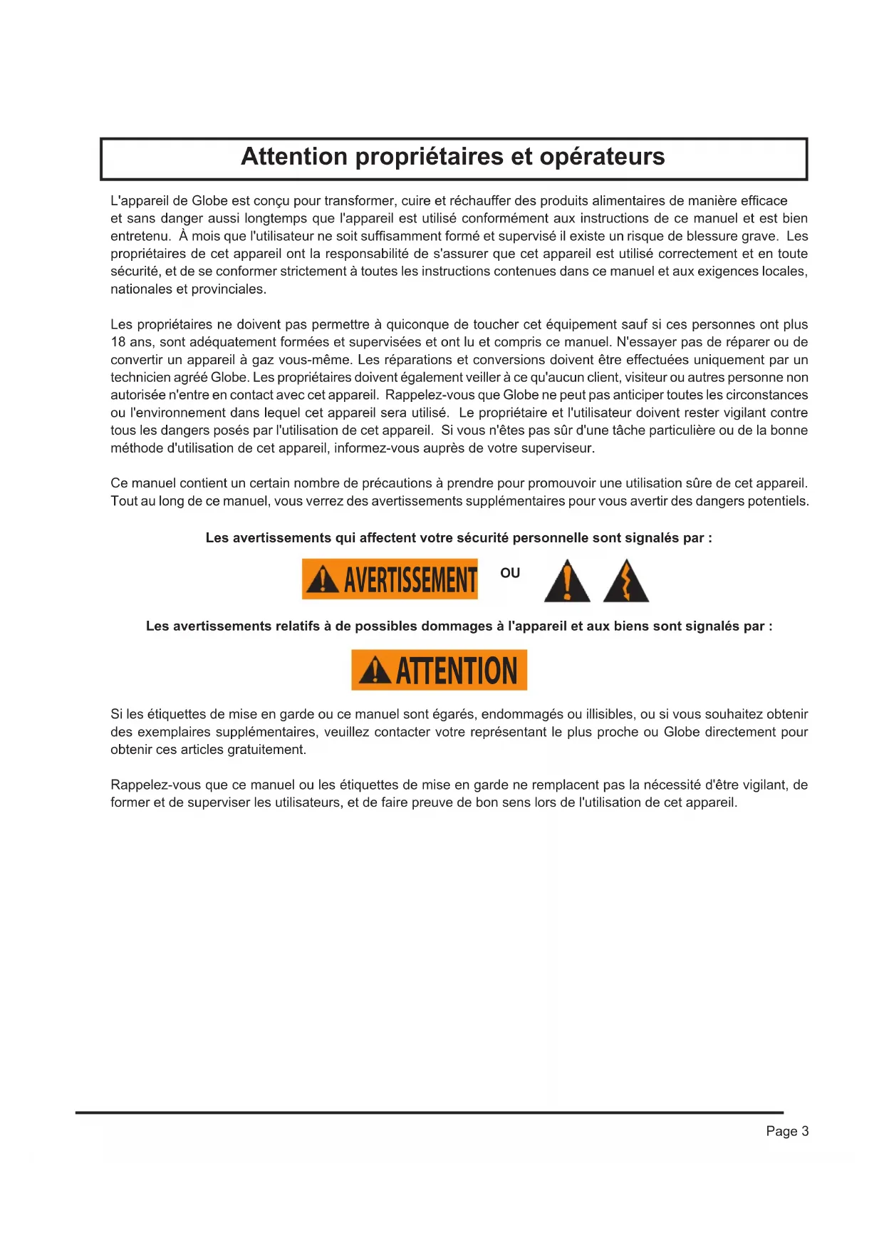 L'appareil de Globe est concu pour transformer, cuire et rechauffer des produits alimentaires de maniere efficace et sans danger aussi longtemps que l'appareil est utilise conformement aux instructions de ce manuel et est bien entretenu. À moins que l'utilisateur ne soit suffisamment formé et supervise il existe un risque de blessure grave. Les propriétaires de cet apparil ont la responsabilité de s'assurer que cet apparil est utilise correctement et en toute sécurité, et de se conformer strictement à toutes les instructions contenues dans ce manuel et aux exigences locales, nationales et provinciales.